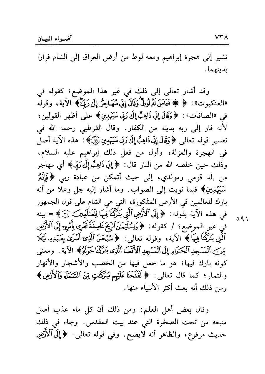 وقد أشار تعالى إلى ذلك في غير هذا الموضع؛ كقوله في "العنكبوت": {فَآمَنَ لَهُ لُوطٌ وَقَال إِنِّي مُهَاجِرٌ إِلَى رَبِّي} الآية، وقوله في "الصافات": {وَقَال إِنِّي ذَاهِبٌ إِلَى رَبِّي سَيَهْدِينِ} على أظهر القولين؛ لأنه فار إلى ربه بدينه من الكفار. وقال القرطبي رحمه الله في تفسير قوله تعالى {وَقَال إِنِّي ذَاهِبٌ إِلَى رَبِّي سَيَهْدِينِ (٩٩)}: هذه الآية أصل في الهجرة والعزلة، وأول من فعل ذلك إبراهيم عليه السلام ، وذلك حين خلصه الله من النار قال: {إِنِّي ذَاهِبٌ إِلَى رَبِّي} أي مهاجر من بلد قومي ومولدي، إلى حيث أتمكن من عبادة ربي {فَإِنَّهُ سَيَهْدِينِ} فيما نويت إلى الصواب. وما أشار إليه جل وعلا من أنه بارك للعالمين في الأرض المذكورة، التي هي الشام على قول الجمهور في هذه الآية بقوله: {إِلَى الْأَرْضِ الَّتِي بَارَكْنَا فِيهَا لِلْعَالمِينَ (٧١)} = بينه في غير الموضع؛ كقوله: {وَلِسُلَيمَانَ الرِّيحَ عَاصِفَةً تَجْرِي بِأَمْرِهِ إِلَى الْأَرْضِ الَّتِي بَارَكْنَا فِيهَا} الآية، وقوله تعالى: {سُبْحَانَ الَّذِي أَسْرَى بِعَبْدِهِ لَيلًا مِنَ الْمَسْجِدِ الْحَرَامِ إِلَى الْمَسْجِدِ الْأَقْصَى الَّذِي بَارَكْنَا حَوْلَهُ} الآية. ومعنى كونه بارك فيها؛ هو ما جعل فيها من الخصب والأشجار والأنهار والثمار؛ كما قال تعالى: {لَفَتَحْنَا عَلَيهِمْ بَرَكَاتٍ مِنَ السَّمَاءِ وَالْأَرْضِ} ومن ذلك أنه بعث أكثر الأنبياء منها.