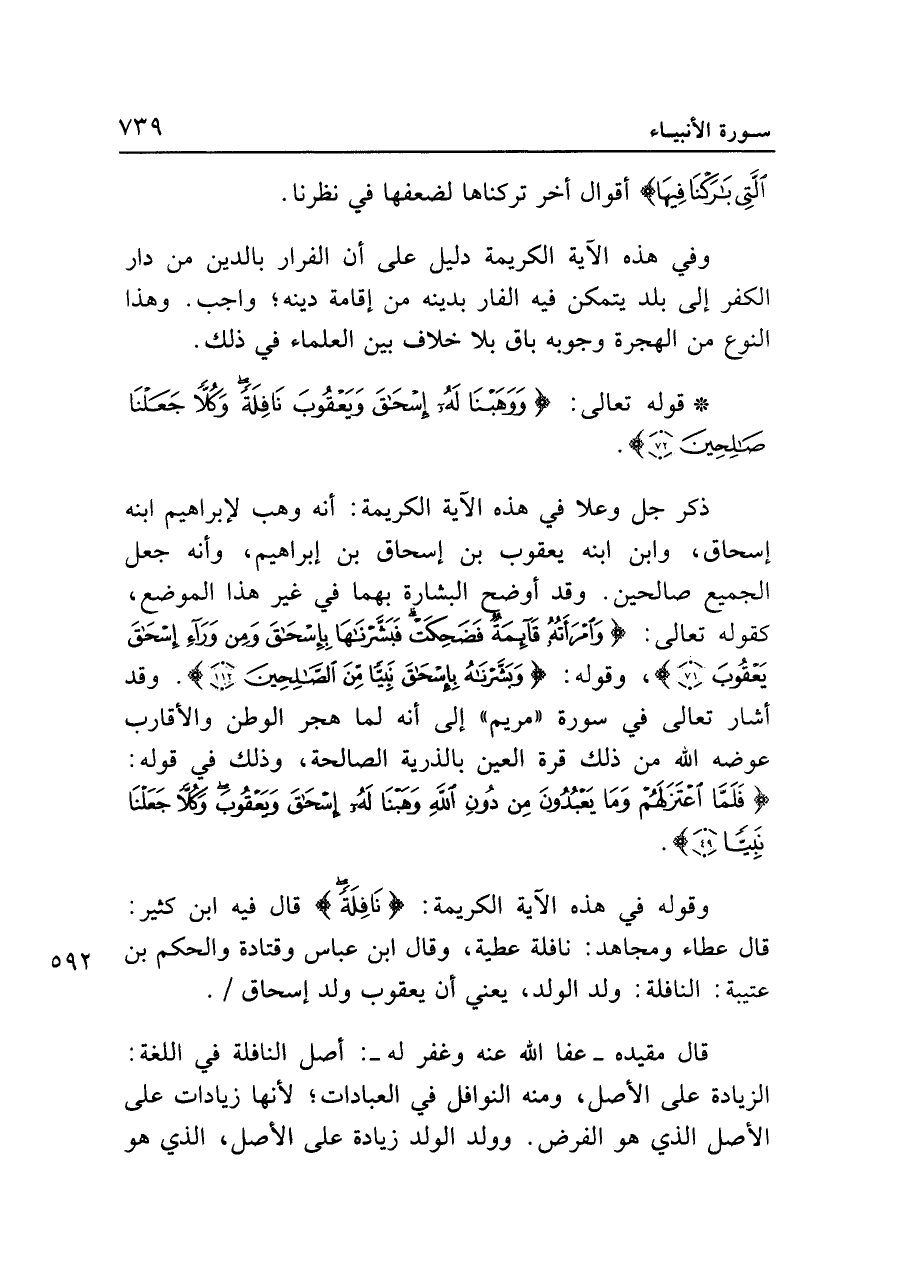 • قوله تعالى: {وَوَهَبْنَا لَهُ إِسْحَاقَ وَيَعْقُوبَ نَافِلَةً وَكُلًّا جَعَلْنَا صَالِحِينَ (٧٢)}.
