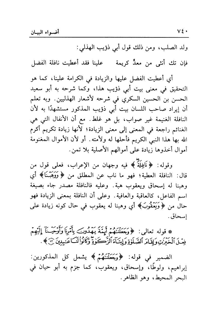 أي أعطيت الفضل عليها والزيادة في الكرامة علينا، كما هو التحقيق في معنى بيت أبي ذؤيب هذا، وكما شرحه به أبو سعيد الحسن بن الحسين السكري في شرحه لأشعار الهذليين. وبه تعلم أن إيراد صاحب اللسان بيت أبي ذؤيب المذكور مستشهدًا به لأن النافلة الغنيمة غير صواب، بل هو غلط. مع أن الأنفال التي هي الغنائم راجعة في المعنى إلى معنى الزيادة؛ لأنها زيادة تكريم أكرم الله بها هذا النبي الكريم فأحلها له ولأمته. أو لأن الأموال المغنومة أموال أخذوها زيادة علي أموالهم الأصلية بلا تمن.
