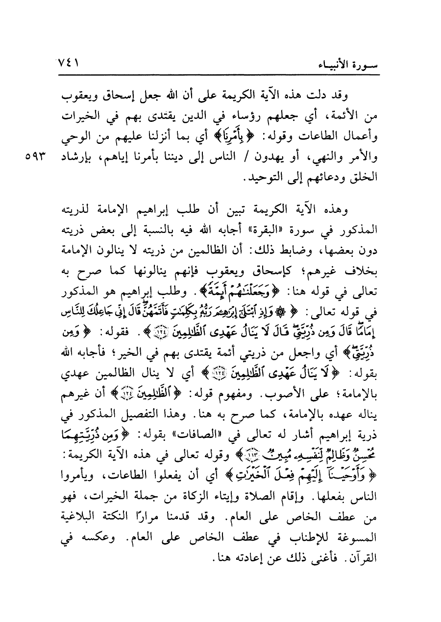 وهذه الآية الكريمة تبين أن طلب إبراهيم الإمامة لذريته المذكور في سورة "البقرة" أجابه الله فيه بالنسبة إلى بعض ذريته دون بعضها، وضابط ذلك: أن الظالمين من ذريته لا ينالون الإمامة بخلاف غيرهم؛ كإسحاق ويعقوب فإنهم ينالونها كما صرح به تعالى في قوله هنا: {وَجَعَلْنَاهُمْ أَئِمَّةً}. وطلب إبراهيم هو المذكور في قوله تعالى: {وَإِذِ ابْتَلَى إِبْرَاهِيمَ رَبُّهُ بِكَلِمَاتٍ فَأَتَمَّهُنَّ قَال إِنِّي جَاعِلُكَ لِلنَّاسِ إِمَامًا قَال وَمِنْ ذُرِّيَّتِي قَال لَا يَنَالُ عَهْدِي الظَّالِمِينَ (١٢٤)}. فقوله: {وَمِنْ ذُرِّيَّتِي} أي وإجعل من ذريتي أئمة يقتدى بهم في الخير؛ فأجابه الله بقوله: {لَا يَنَالُ عَهْدِي الظَّالِمِينَ} أي لا ينال الظالمين عهدي بالإمامة؛ على الأصوب. ومفهوم قوله: {الظَّالِمِينَ} أن غيرهم يناله عهده بالإمامة، كما صرح به هنا. وهذا التفصيل المذكور في ذرية إبراهيم أشار له تعالى في "الصافات" بقهوله: {وَمِنْ ذُرِّيَّتِهِمَا مُحْسِنٌ وَظَالِمٌ لِنَفْسِهِ مُبِينٌ (١١٣)} وقوله تعالى في هذه الآية الكريمة: {وَأَوْحَينَا إِلَيهِمْ فِعْلَ الْخَيرَاتِ} أي أن يفعلوا الطاعات، ويأمروا الناس بفعلها. وإقام الصلاة وإيتاء الزكاة من جملة الخيرات، فهو من عطف الخاص على العام. وقد قدمنا مرارًا النكتة البلاغية المسوغة للإطناب في عطف الخاص على العام. وعكسه في القرآن. فأغنى ذلك عن إعادته هنا.