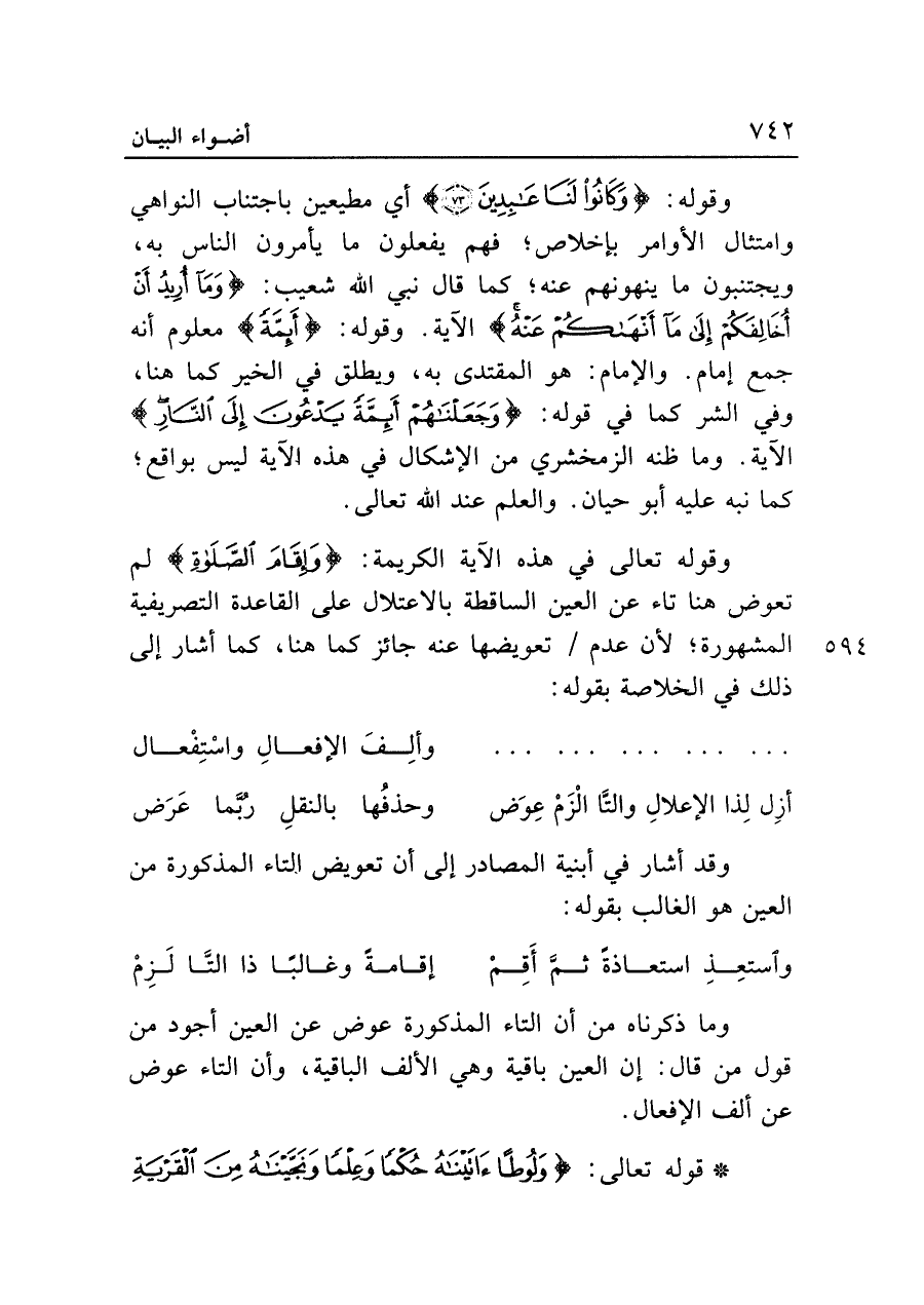 وقوله: {وَكَانُوا لَنَا عَابِدِينَ (٧٣)} أي مطيعين باجتناب النواهي وامتثال الأوامر بإخلاص؛ فهم يفعلون ما يأمرون الناس به، ويجتنبون ما ينهونهم عنه؛ كما قال نبي الله شعيب: {وَمَا أُرِيدُ أَنْ أُخَالِفَكُمْ إِلَى مَا أَنْهَاكُمْ عَنْهُ} الآية. وقوله: {أَئِمَّةً} معلوم أنه جمع إمام. والإمام: هو المقتدى به، ويطلق في الخير كما هنا، وفي الشر كما في قوله: {وَجَعَلْنَاهُمْ أَئِمَّةً يَدْعُونَ إِلَى النَّارِ} الآية. وما ظنه الزمخشري من الإشكال في هذه الآية ليس بواقع؛ كما نبه عليه أبو حيان. والعلم عند الله تعالى.