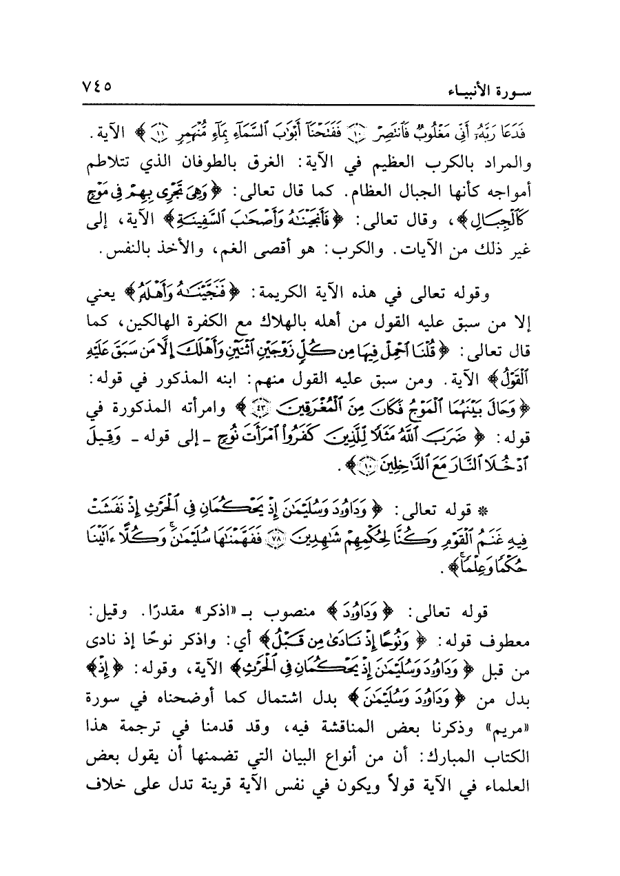 قوله تعالى: {وَدَاوُودَ} منصوب بـ"اذكر" مقدرًا. وقيل: معطوف قوله: {وَنُوحًا إِذْ نَادَى مِنْ قَبْلُ} أي: واذكر نوحًا إذ نادى من قبل {وَدَاوُودَ وَسُلَيمَانَ إِذْ يَحْكُمَانِ فِي الْحَرْثِ} الآية، وقوله: {إِذْ} بدل من {وَدَاوُودَ وَسُلَيمَانَ} بدل اشتمال كما أوضحناه في سورة "مريم" وذكرنا بعض المناقشة فيه، وقد قدمنا في ترجمة هذا الكتاب المبارك: أن من أنواع البيان التي تضمنها أن يقول بعض العلماء في الآية قولًا ويكون في نفس الآية قرينة تدل على خلاف