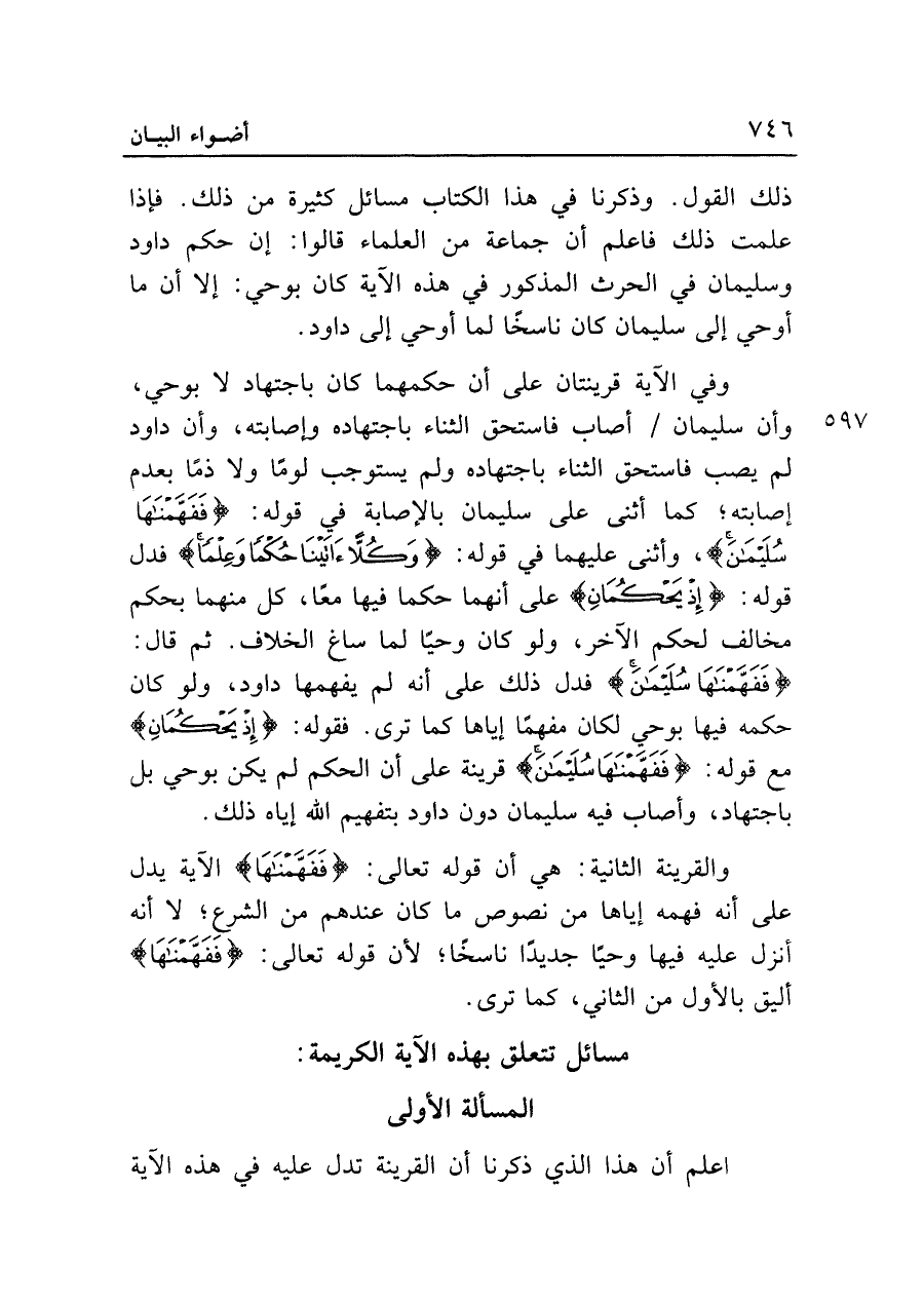 والقرينة الثانية: هي أن قوله تعالى: {فَفَهَّمْنَاهَا} الآية يدل على أنه فهمه إياها من نصوص ما كان عندهم من الشرع؛ لا أنه أنزل عليه فيها وحيًا جديدًا ناسخًا؛ لأن قوله تعالى: {فَفَهَّمْنَاهَا} أليق بالأول من الثاني، كما ترى.