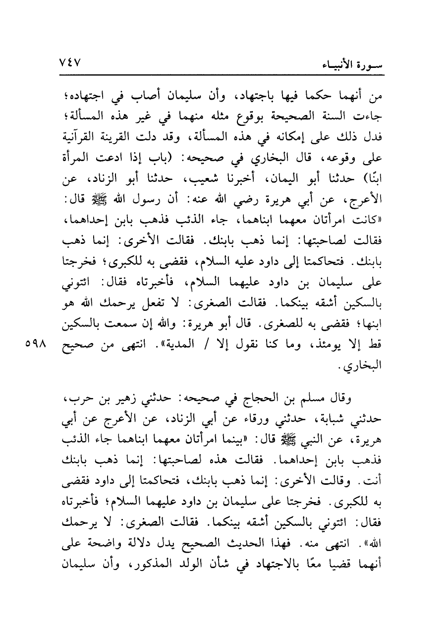 من أنهما حكما فيها باجتهاد، وأن سليمان أصاب في اجتهاده؛ جاءت السنة الصحيحة بوقوع مثله منهما في غير هذه المسألة؛ فدل ذلك على إمكانه في هذه المسألة، وقد دلت القرينة القرآنية على وقوعه، قال البخاري في صحيحه: (باب إذا ادعت المرأة ابنًا) حدثنا أبو اليمان، أخبرنا شعيب، حدثنا أبو الزناد، عن الأعرج، عن أبي هريرة رضي الله عنه: أن رسول الله - صلى الله عليه وسلم - قال: "كانت امرأتان معهما ابناهما، جاء الذئب فذهب بابن إحداهما، فقالت لصاحبتها: إنما ذهب بابنك. فقالت الأخرى: إنما ذهب بابنك. فتحاكمتا إلى داود عليه السلام ، فقضى به للكبرى، فخرجتا على سليمان بن داود عليهما السلام، فأخبرتاه فقال: ائتوني بالسكين أشقه بينكما. فقالت الصغرى: لا تفعل يرحمك الله هو ابنها؛ فقضى به للصغرى. قال أبو هريرة: والله إن سمعت بالسكين قط إلا يومئذ، وما كنا نقول إلا المدية". انتهى من صحيح البخاري.
