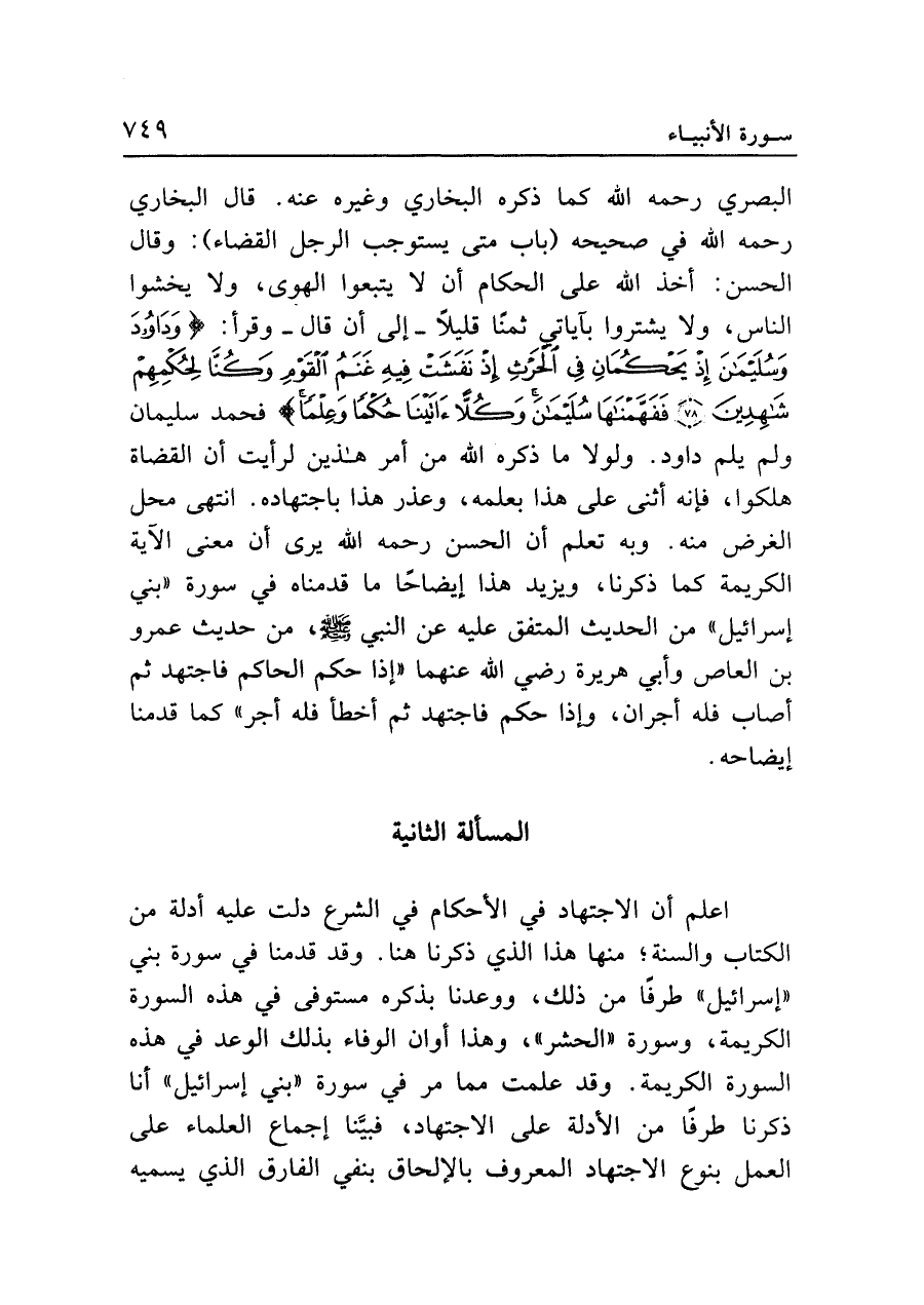 البصري رحمه الله كما ذكره البخاري وغيره عنه. قال البخاري رحمه الله في صحيحه (باب متى يستوجب الرجل القضاء): وقال الحسن: أخذ الله على الحكام أن لا يتبعوا الهوى، ولا يخشوا الناس، ولا يشتروا بآياتي ثمنًا قليلًا -إلى أن قال- وقرأ: {وَدَاوُودَ وَسُلَيمَانَ إِذْ يَحْكُمَانِ فِي الْحَرْثِ إِذْ نَفَشَتْ فِيهِ غَنَمُ الْقَوْمِ وَكُنَّا لِحُكْمِهِمْ شَاهِدِينَ (٧٨) فَفَهَّمْنَاهَا سُلَيمَانَ وَكُلًّا آتَينَا حُكْمًا وَعِلْمًا} فحمد سليمان ولم يلم داود. ولولا ما ذكره الله من أمر هذين لرأيت أن القضاة هلكوا، فإنه أثنى على هذا بعلمه، وعذر هذا باجتهاده. انتهى محل الغرض منه. وبه تعلم أن الحسن رحمه الله يرى أنا معنى الآية الكريمة كما ذكرنا، ويزيد هذا إيضاحًا ما قدمناه في سورة "بني إسرائيل" من الحديث المتفق عليه عن النبي - صلى الله عليه وسلم -، من حديث عمرو بن العاص وأبي هريرة رضي الله عنهما "إذا حكم الحاكم فاجتهد ثم أصاب فله أجران، وإذا حكم فاجتهد ثم أخطأ فله أجر" كما قدمنا إيضاحه.
