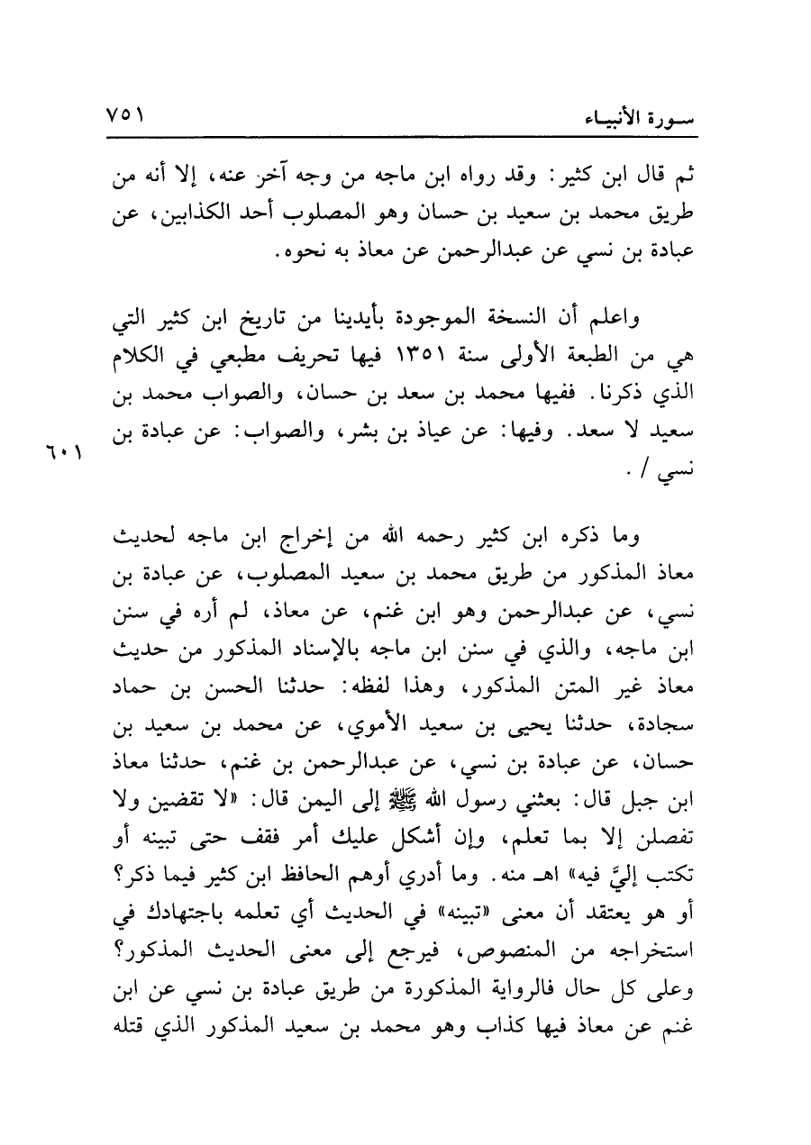 وما ذكره ابن كثير رحمه الله من إخراج ابن ماجه لحديث معاذ المذكور من طريق محمد بن سعيد المصلوب، عن عبادة بن نسي، عن عبد الرحمن وهو ابن غنم، عن معاذ، لم أره في سنن ابن ماجه، والذي في سنن ابن ماجه بالإسناد المذكور من حديث معاذ غير المتن المذكور، وهذا لفظه: حدثنا الحسن بن حماد سجادة، حدثنا يحيى بن سعيد الأموي، عن محمد بن سعيد بن حسان، عن عبادة بن نسي، عن عبد الرحمن بن غنم، حدثنا معاذ بن جبل قال: بعثني رسول الله - صلى الله عليه وسلم - إلى اليمن قال: "لا تقضين ولا تفصلن إلا بما تعلم، وإن أشكل عليك أمر فقف حتى تبينه أو تكتب إليَّ فيه" اهـ منه. وما أدري أوهم الحافظ ابن كثير فيما ذكر؟ أو هو يعتقد أن معنى "تبينه" في الحديث أي تعلمه باجتهادك في استخراجه من المنصوص، فيرجع إلى معنى الحديث المذكور؟ وعلى كل حال فالرواية المذكورة من طريق عبادة بن نسي عن ابن غنم عن معاذ فيها كذاب وهو محمد بن سعيد المذكور الذي قتله
