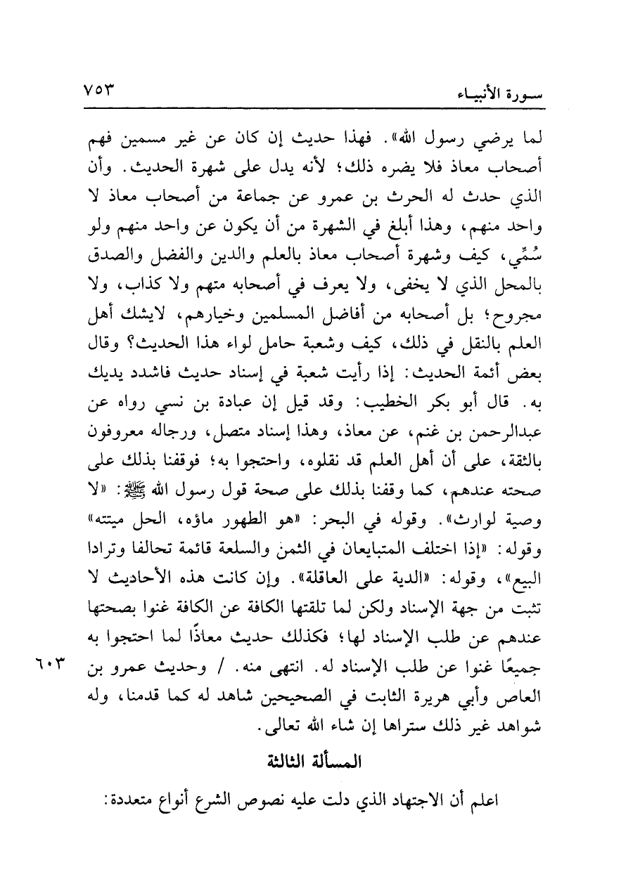 لما يرضي رسول الله". فهذا حديث إن كان عن غير مسمين فهم أصحاب معاذ فلا يضره ذلك؛ لأنه يدل على شهرة الحديث. وأن الذي حدث له الحرث بن عمرو عن جماعة من أصحاب معاذ لا واحد منهم، وهذا أبلغ في الشهرة من أن يكون عن واحد منهم ولو سُمِّي، كيف وشهرة أصحاب معاذ بالعلم والدين والفضل والصدق بالمحل الذي لا يخفى، ولا يعرف في أصحابه متهم ولا كذاب، ولا مجروح؛ بل أصحابه من أفاضل المسلمين وخيارهم، لا يشك أهل العلم بالنقل في ذلك، كيف وشعبة حامل لواء هذا الحديث؟ وقال بعض أئمة الحديث: إذا رأيت شعبة في إسناد حديث فاشدد يديك به. قال أبو بكر الخطيب: وقد قيل إن عبادة بن نسي رواه عن عبد الرحمن بن غنم، عن معاذ، وهذا إسناد متصل، ورجاله معروفون بالثقة، على أن أهل العلم قد نقلوه، واحتجوا به؛ فوقفنا بذلك على صحته عندهم، كما وقفنا بذلك على صحة قول رسول الله - صلى الله عليه وسلم -: "لا وصية لوارث". وقوله في البحر: "هو الطهور ماؤه، الحل ميتته" وقوله: "إذا اختلف المتبايعان في الثمن والسلعة قائمة تحالفا وترادا البيع"، وقوله: "الدية على العاقلة". وإن كانت هذه الأحاديث لا تثبت من جهة الإسناد ولكن لما تلقتها الكافة عن الكافة غنوا بصحتها عندهم عن طلب الإسناد لها؛ فكذلك حديث معاذًا لما احتجوا به جميعًا غنوا عن طلب الإسناد له. انتهى منه. وحديث عمرو بن العاص وأبي هريرة الثابت في الصحيحين شاهد له كما قدمنا، وله شواهد غير ذلك ستراها إن شاء الله تعالى.