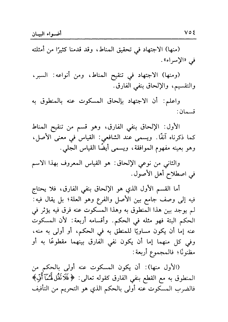 أما القسم الأول الذي هو الإلحاق بنفي الفارق، فلا يحتاج فيه إلى وصف جامع بين الأصل والفرع وهو العلة؛ بل يقال فيه: لم يوجد بين هذا المنطوق به وهذا المسكوت عنه فرق فيه يؤثر في الحكم البتة فهو مثله في الحكم. وأقسامه أربعة: لأن المسكوت عنه إما أن يكون مساويًا للمنطق به في الحكم، أو أولى به منه، وفي كل منهما إما أن يكون نفي الفارق بينهما مقطوعًا به أو مظنونًا؛ فالمجموع أربعة: