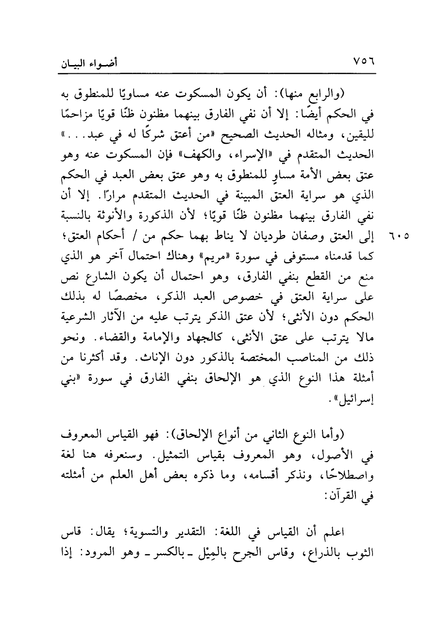 (والرابع منها): أن يكون المسكوت عنه مساويًا للمنطوق به في الحكم أيضًا: إلا أن نفي الفارق بينهما مظنون ظنًّا قويًّا مزاحمًا لليقين، ومثاله الحديث الصحيح "من أعتق شركًا له في عبد ... " الحديث المتقدم في "الإسراء، والكهف" فإن المسكوت عنه وهو عتق بعض الأمة مساوٍ للمنطوق به وهو عتق بعض العبد في الحكم الذي هو سراية العتق المبينة في الحديث المتقدم مرارًا. إلا أن نفي الفارق بينهما مظنون ظنًّا قويًّا؛ لأن الذكورة والأنوثة بالنسبة إلى العتق وصفان طرديان لا يناط بهما حكم من أحكام العتق؛ كما قدمناه مستوفى في سورة "مريم" وهناك احتمال آخر هو الذي منع من القطع بنفي الفارق، وهو احتمال أن يكون الشارع نص على سراية العتق في خصوص العبد الذكر، مخصصًا له بذلك الحكم دون الأنثى؛ لأن عتق الذكر يترتب عليه من الآثار الشرعية ما لا يترتب على عتق الأنثى، كالجهاد والإمامة والقضاء. ونحو ذلك من المناصب المختصة بالذكور دون الإناث. وقد أكثرنا من أمثلة هذا النوع الذي هو الإلحاق بنفي الفارق في سورة "بني إسرائيل".