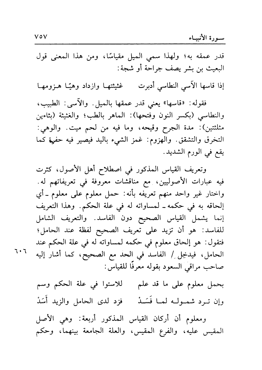 وتعريف القياس المذكور في اصطلاح أهل الأصول، كثرت فيه عبارات الأصوليين، مع مناقشات معروفة في تعريفاتهم له. واختار غير واحد منهم تعريفه بأنه: حمل معلوم على معلوم -أي إلحاقه به في حكمه- لمساواته له في علة الحكم. وهذا التعريف إنما يشمل القياس الصحيح دون الفاسد. والتعريف الشامل للفاسد: هو أن تزيد على تعريف الصحيح لفظة عند الحامل؛ فتقول: هو إلحاق معلوم في حكمه لمساواته له في علة الحكم عند الحامل، فيدخل الفاسد في الحد مع الصحيح، كما أشار إليه صاحب مراقي السعود بقوله معرفًا للقياس: