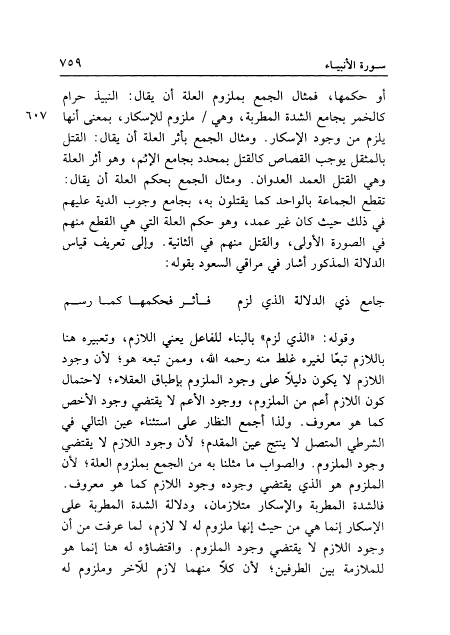وقوله: "الذي لزم" بالبناء للفاعل يعني اللازم، وتعبيره هنا باللازم تبعًا لغيره غلط منه رحمه الله، وممن تبعه هو؛ لأن وجود اللازم لا يكون دليلًا على وجود الملزوم بإطباق العقلاء؛ لاحتمال كون اللازم أعم من الملزوم، ووجود الأعم لا يقتضي وجود الأخص كما هو معروف. ولذا أجمع النظار على استثناء عين التالي في الشرطي المتصل لا ينتج عين المقدم؛ لأن وجود اللازم لا يقتضي وجود الملزوم. والصواب ما مثلنا به من الجمع بملزوم العلة؛ لأن الملزوم هو الذي يقتضي وجوده وجود اللازم كما هو معروف. فالشدة المطربة والإسكار متلازمان، ودلالة الشدة المطربة على الإسكار إنما هي من حيث إنها ملزوم له لا لازم، لما عرفت من أن وجود اللازم لا يقتضي وجود الملزوم. واقتضاؤه له هنا إنما هو للملازمة بين الطرفين؛ لأن كلًّا منهما لازم للآخر وملزوم له