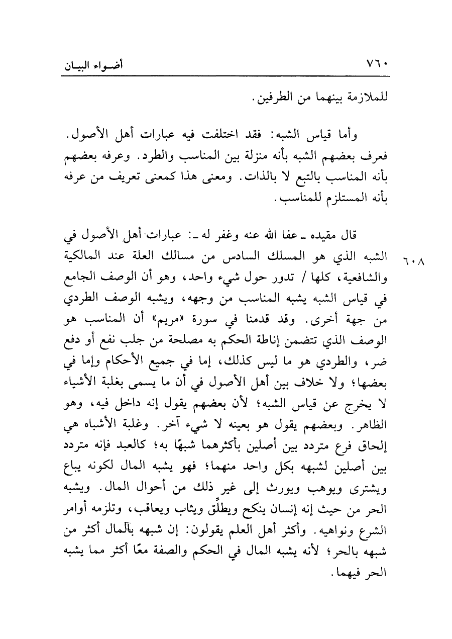 قال مقيده -عفا الله عنه وغفر له-: عبارات أهل الأصول في الشبه الذي هو المسلك السادس من مسالك العلة عند المالكية والشافعية، كلها تدور حول شيء واحد، وهو أن الوصف الجامع في قياس الشبه يشبه المناسب من وجهه، ويشبه الوصف الطردي من جهة أخرى. وقد قدمنا في سورة "مريم" أن المناسب هو الوصف الذي تتضمن إناطة الحكم به مصلحة من جلب نفع أو دفع ضر، والطردي هو ما ليس كذلك، إما في جميع الأحكام وإما في بعضها؛ ولا خلاف بين أهل الأصول في أن ما يسمى بغلبة الأشياء لا يخرج عن قياس الشبه؛ لأن بعضهم يقول إنه داخل فيه، وهو الظاهر. وبعضهم يقول هو بعينه لا شيء آخر. وغلبة الأشباه هي إلحاق فرع متردد بين أصلين بأكثرهما شبهًا به؛ كالعبد فإنه متردد بين أصلين لشبهه بكل واحد منهما؛ فهو يشبه المال لكونه يباع ويشترى ويوهب ويورث إلى غير ذلك من أحوال المال. ويشبه الحر من حيث إنه إنسان ينكح ويطلِّق ويثاب ويعاقب، وتلزمه أوامر الشرع ونواهيه. وأكثر أهل العلم يقولون: إن شبهه بالمال أكثر من شبهه بالحر؛ لأنه يشبه المال في الحكم والصفة معًا أكثر مما يشبه الحر فيهما.
