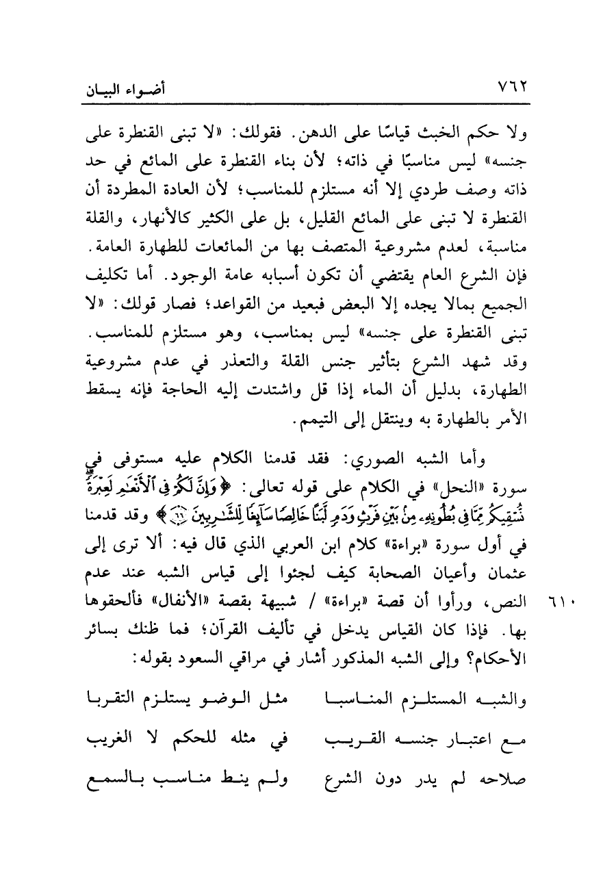 وأما الشبه الصوري: فقد قدمنا الكلام عليه مستوفى في سورة "النحل" في الكلام على قوله تعالى: {وَإِنَّ لَكُمْ فِي الْأَنْعَامِ لَعِبْرَةً نُسْقِيكُمْ مِمَّا فِي بُطُونِهِ مِنْ بَينِ فَرْثٍ وَدَمٍ لَبَنًا خَالِصًا سَائِغًا لِلشَّارِبِينَ (٦٦)} وقد قدمنا في أول سورة "براءة" كلام ابن العربي الذي قال فيه: ألا ترى إلى عثمان وأعيان الصحابة كيف لجئوا إلى قياس الشبه عند عدم النص، ورأوا أن قصة "براءة" شبيهة بقصة "الأنفال" فألحقوها بها. فإذا كان القياس يدخل في تأليف القرآن؛ فما ظنك بسائر الأحكام؟ وإلى الشبه المذكور أشار في مراقي السعود بقوله: