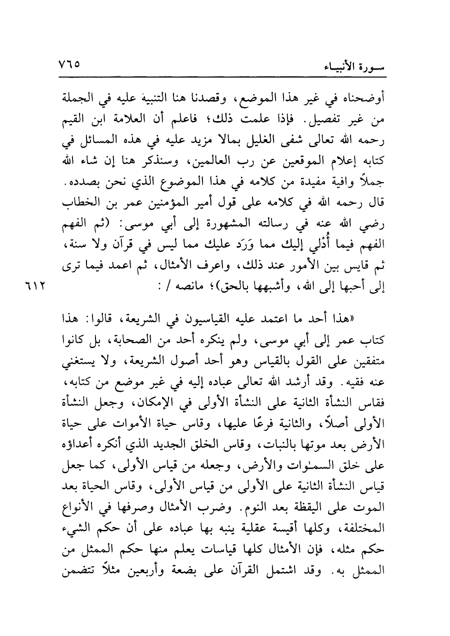 أوضحناه في غير هذا الموضع، وقصدنا هنا التنبيه عليه في الجملة من غير تفصيل. فإذا علمت ذلك؛ فاعلم أن العلامة ابن القيم رحمه الله تعالى شفى الغليل بما لا مزيد عليه في هذه المسائل في كتابه إعلام الموقعين عن رب العالمين، وسنذكر هنا إن شاء الله جملًا وافية مفيدة من كلامه في هذا الموضوع الذي نحن بصدده. قال رحمه الله في كلامه على قول أمير المؤمنين عمر بن الخطاب رضي الله عنه في رسالته المشهورة إلى أبي موسى: (ثم الفهم الفهم فيما أُدْلي إليك مما وَرَد عليك مما ليس في قرآن ولا سنة، ثم قايس بين الأمور عند ذلك، واعرف الأمثال، ثم اعمد فيما ترى إلى أحبها إلى الله، وأشبهها بالحق)؛ ما نصه: