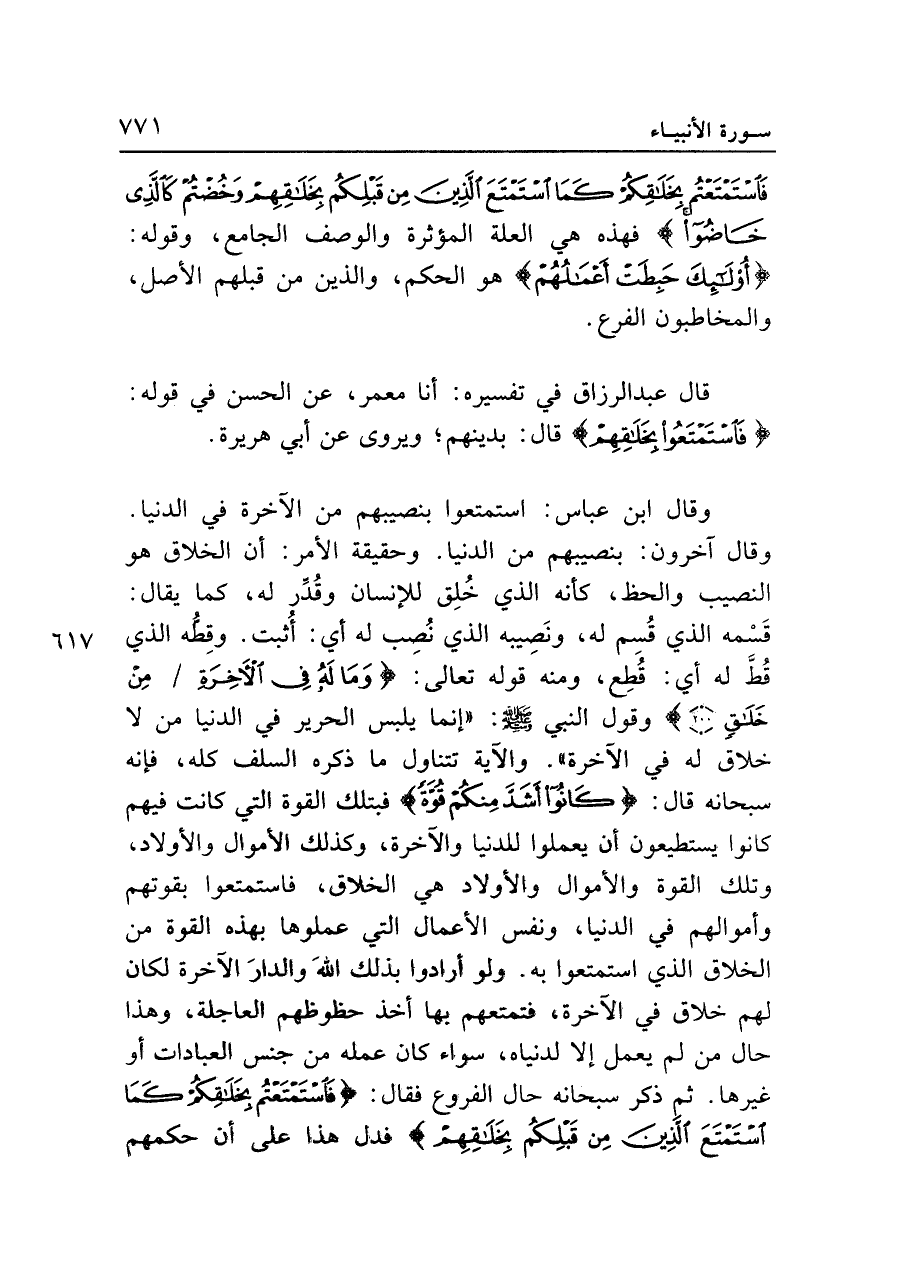 وقال ابن عباس: استمتعوا بنصيبهم من الآخرة في الدنيا. وقال آخرون: بنصيبهم من الدنيا. وحقيقة الأمر: أن الخلاق هو النصيب والحظ، كأنه الذي خُلِق للإنسان وقُدِّر له، كما يقال: قَسْمه الذي قُسِم له، ونَصِيبه الذي نُصب له أي: أُثبت. وقِطُّه الذي قُطَّ له أي: قُطِع، ومنه قوله تعالى: {وَمَا لَهُ فِي الْآخِرَةِ مِنْ خَلَاقٍ (٢٠٠)} وقول النبي - صلى الله عليه وسلم -: "إنما يلبس الحرير في الدنيا من لا خلاق له في الآخرة". والآية تتناول ما ذكره السلف كله، فإنه سبحانه قال: {كَانُوا أَشَدَّ مِنْكُمْ قُوَّةً} فبتلك القوة التي كانت فيهم كانوا يستطيعون أن يعملوا للدنيا والآخرة، وكذلك الأموال والأولاد، وتلك القوة والأموال والأولاد هي الخلاق، فاستمتعوا بقوتهم وأموالهم في الدنيا، ونفس الأعمال التي عملوها بهذه القوة من الخلاق الذي استمتعوا به. ولو أرادوا بذلك اللهَ والدارَ الآخرة لكان لهم خلاق في الآخرة، فتمتعهم بها أخذ حظوظهم العاجلة، وهذا حال من لم يعمل إلا لدنياه، سواء كان عمله من جنس العبادات أو غيرها. ثم ذكر سبحانه حال الفروع فقال: {فَاسْتَمْتَعْتُمْ بِخَلَاقِكُمْ كَمَا اسْتَمْتَعَ الَّذِينَ مِنْ قَبْلِكُمْ بِخَلَاقِهِمْ} فدل هذا على أن حكمهم