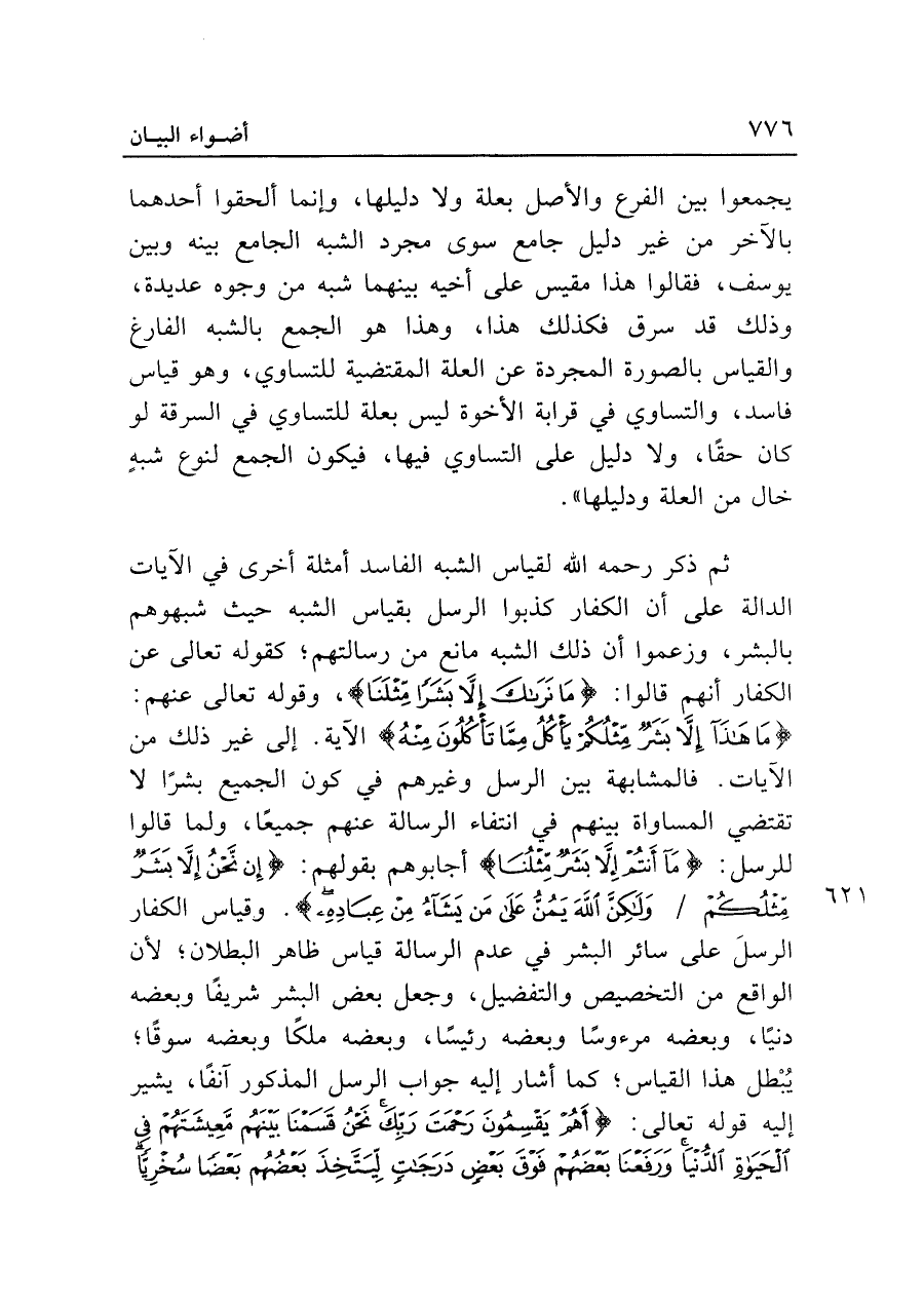ثم ذكر رحمه الله لقياس الشبه الفاسد أمثلة أخرى في الآيات الدالة على أن الكفار كذبوا الرسل بقياس الشبه حيث شبهوهم بالبشر، وزعموا أن ذلك الشبه مانع من رسالتهم، كقوله تعالى عن الكفار أنهم قالوا: {مَا نَرَاكَ إلا بَشَرًا مِثْلَنَا}، وقوله تعالى عنهم: {مَا هَذَا إلا بَشَرٌ مِثْلُكُمْ يَأْكُلُ مِمَّا تَأْكُلُونَ مِنْهُ} الآية. إلى غير ذلك من الآيات. فالمشابهة بين الرسل وغيرهم في كون الجميع بشرًا لا تقتضي المساواة بينهم في انتفاء الرسالة عنهم جميعًا، ولما قالوا للرسل: {مَا أَنْتُمْ إلا بَشَرٌ مِثْلُنَا} أجابوهم بقولهم: {إِنْ نَحْنُ إلا بَشَرٌ مِثْلُكُمْ وَلَكِنَّ اللَّهَ يَمُنُّ عَلَى مَنْ يَشَاءُ مِنْ عِبَادِهِ}. وقياس الكفار الرسلَ على سائر البشر في عدم الرسالة قياس ظاهر البطلان؛ لأن الواقع من التخصيص والتفضيل، وجعل بعض البشر شريفًا وبعضه دنيًا، وبعضه مرءوسًا وبعضه رئيسًا، وبعضه ملكًا وبعضه سوقًا؛ يُبْطل هذا القياس؛ كما أشار إليه جواب الرسل المذكور آنفًا، يشير إليه قوله تعالى: {أَهُمْ يَقْسِمُونَ رَحْمَتَ رَبِّكَ نَحْنُ قَسَمْنَا بَينَهُمْ مَعِيشَتَهُمْ فِي الْحَيَاةِ الدُّنْيَا وَرَفَعْنَا بَعْضَهُمْ فَوْقَ بَعْضٍ دَرَجَاتٍ لِيَتَّخِذَ بَعْضُهُمْ بَعْضًا سُخْرِيًّا