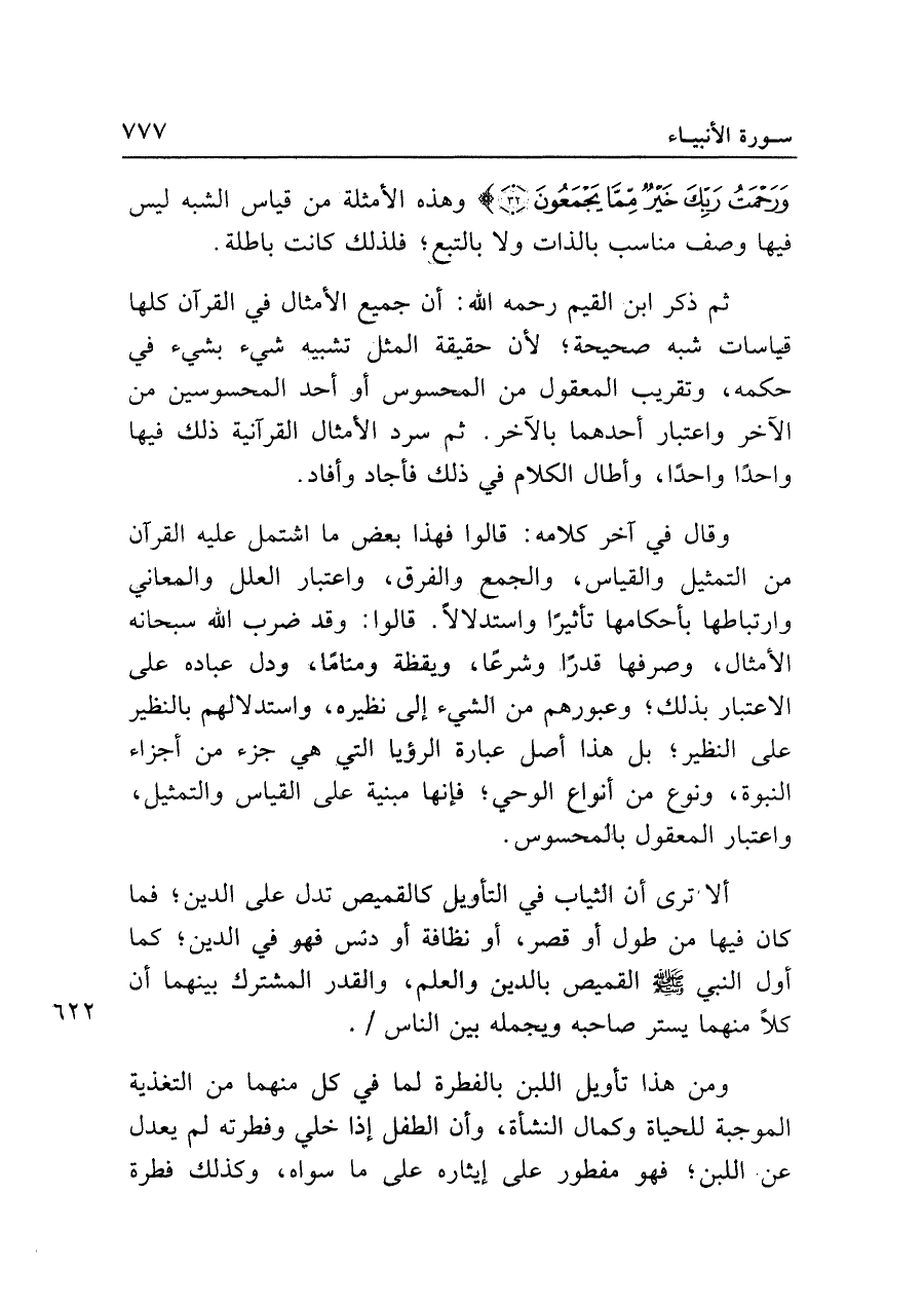 وقال في آخر كلامه: قالوا فهذا بعض ما اشتمل عليه القرآن من التمثيل والقياس، والجمع والفرق، واعتبار العلل والمعاني وارتباطها بأحكامها تأثيرًا واستدلالًا. قالوا: وقد ضرب الله سبحانه الأمثال، وصرفها قدرًا وشرعًا، ويقظة ومنامًا، ودل عباده على الاعتبار بذلك؛ وعبورهم من الشيء إلى نظيره، واستدلالهم بالنظير على النظير؛ بل هذا أصل عبارة الرؤيا التي هي جزء من أجزاء النبوة، ونوع من أنواع الوحي؛ فإنها مبنية على القياس والتمثيل، واعتبار المعقول بالمحسوس.