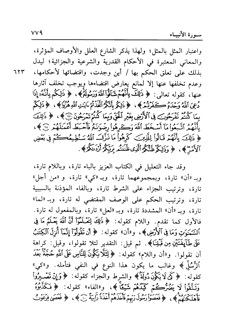 واعتبار المثل بالمثل؛ ولهذا يذكر الشارع العلل والأوصاف المؤثرة، والمعاني المعتبرة في الأحكام القدرية والشرعية والجزائية؛ ليدل بذلك على تعلق الحكم بها أين وجدت، واقتضائها لأحكامها، وعدم تخلفها عنها إلا لمانع يعارض اقتضاءها ويوجب تخلف آثارها عنها، كقوله تعالى: {ذَلِكَ بِأَنَّهُمْ شَاقُّوا اللَّهَ وَرَسُولَهُ}، {ذَلِكُمْ بِأَنَّهُ إِذَا دُعِيَ اللَّهُ وَحْدَهُ كَفَرْتُمْ}، {ذَلِكُمْ بِأَنَّكُمُ اتَّخَذْتُمْ آيَاتِ اللَّهِ هُزُوًا}، {ذَلِكُمْ بِمَا كُنْتُمْ تَفْرَحُونَ فِي الْأَرْضِ بِغَيرِ الْحَقِّ وَبِمَا كُنْتُمْ تَمْرَحُونَ (٧٥)}، {ذَلِكَ بِأَنَّهُمُ اتَّبَعُوا مَا أَسْخَطَ اللَّهَ وَكَرِهُوا رِضْوَانَهُ فَأَحْبَطَ أَعْمَالهُمْ (٢٨)}، {ذَلِكَ بِأَنَّهُمْ قَالُوا لِلَّذِينَ كَرِهُوا مَا نَزَّلَ اللَّهُ سَنُطِيعُكُمْ فِي بَعْضِ الْأَمْرِ}، {وَذَلِكُمْ ظَنُّكُمُ الَّذِي ظَنَنْتُمْ بِرَبِّكُمْ أَرْدَاكُمْ}.