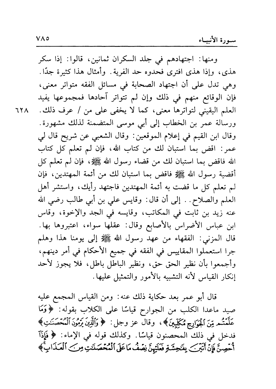 ومنها: اجتهادهم في جلد السكران ثمانين، قالوا: إذا سكر هذى، وإذا هذى افترى فحدوه حد الفرية. وأمثال هذا كثيرة جدًا. وهي تدل على أن اجتهاد الصحابة في مسائل الفقه متواتر معنى، فإن الوقائع منهم في ذلك وإن لم تتواتر آحادها فمجموعها يفيد العلم اليقيني لتواترها معنى، كما لا يخفى على من عرف ذلك. ورسالة عمر بن الخطاب إلى أبي موسى المتضمنة لذلك مشهورة. وقال ابن القيم في إعلام الموقعين: وقال الشعبي عن شريح قال لي عمر: اقض بما استبان لك من كتاب الله، فإن لم تعلم كل كتاب الله فاقض بما استبان لك من قضاء رسول الله - صلى الله عليه وسلم -، فإن لم تعلم كل أقضية رسول الله - صلى الله عليه وسلم - فاقض بما استبان لك من أئمة المهتدين، فإن لم تعلم كل ما قضت به أئمة المهتدين فاجتهد رأيك، واستشر أهل العلم والصلاح .. إلى أن قال: وقايس علي بن أبي طالب رضي الله عنه زيد بن ثابت في المكاتب، وقايسه في الجد والإخوة، وقاس ابن عباس الأضراس بالأصابع وقال: عقلها سواء، اعتبروها بها. قال المزني: الفقهاء من عهد رسول الله - صلى الله عليه وسلم - إلى يومنا هذا وهلم جرا استعملوا المقاييس في الفقه في جميع الأحكام في أمر دينهم، وأجمعوا بأن نظير الحق حق، ونظير الباطل باطل، فلا يجوز لأحد إنكار القياس لأنه التشبيه بالأمور والتمثيل عليها.