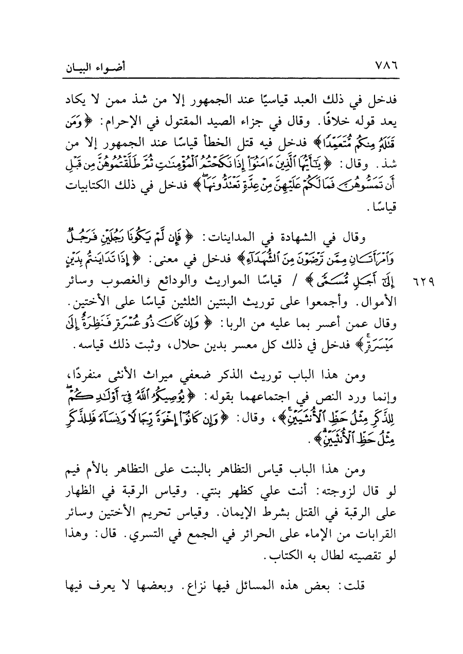 فدخل في ذلك العبد قياسيًا عند الجمهور إلا من شذ ممن لا يكاد يعد قوله خلافًا. وقال في جزاء الصيد المقتول في الإحرام: {وَمَنْ قَتَلَهُ مِنْكُمْ مُتَعَمِّدًا} فدخل فيه قتل الخطأ قياسًا عند الجمهور إلا من شذ. وقال: {يَا أَيُّهَا الَّذِينَ آمَنُوا إِذَا نَكَحْتُمُ الْمُؤْمِنَاتِ ثُمَّ طَلَّقْتُمُوهُنَّ مِنْ قَبْلِ أَنْ تَمَسُّوهُنَّ فَمَا لَكُمْ عَلَيهِنَّ مِنْ عِدَّةٍ تَعْتَدُّونَهَا} فدخل في ذلك الكتابيات قياسًا.