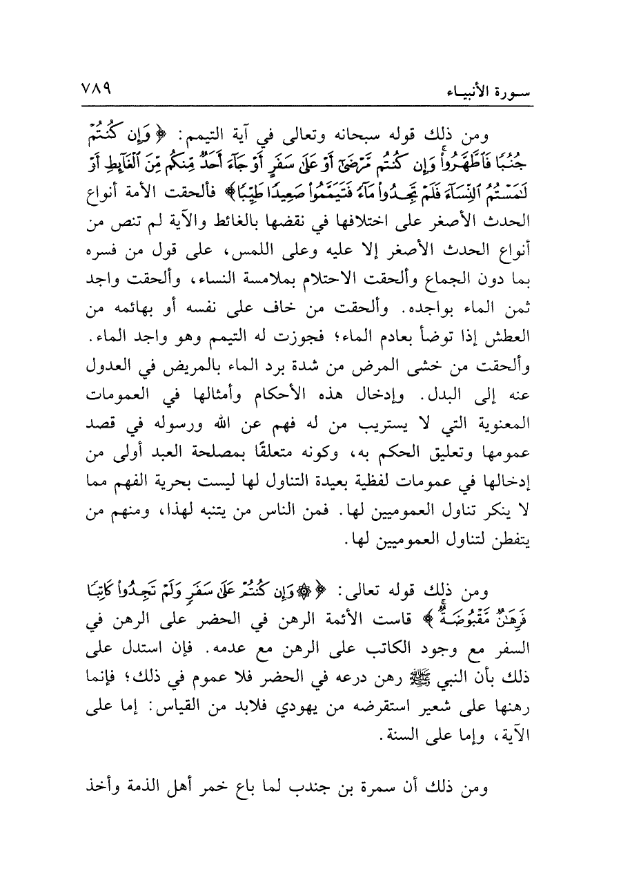 ومن ذلك قوله سبحانه وتعالى في آية التيمم: {وَإِنْ كُنْتُمْ جُنُبًا فَاطَّهَّرُوا وَإِنْ كُنْتُمْ مَرْضَى أَوْ عَلَى سَفَرٍ أَوْ جَاءَ أَحَدٌ مِنْكُمْ مِنَ الْغَائِطِ أَوْ لَامَسْتُمُ النِّسَاءَ فَلَمْ تَجِدُوا مَاءً فَتَيَمَّمُوا صَعِيدًا طَيِّبًا} فألحقت الأمة أنواع الحدث الأصغر على اختلافها في نقضها بالغائط والآية لم تنص من أنواع الحدث الأصغر إلا عليه وعلى اللمس، على قول من فسره بما دون الجماع وألحقت الاحتلام بملامسة النساء، وألحقت واجد ثمن الماء بواجده. وألحقت من خاف على نفسه أو بهائمه من العطش إذا توضأ بعادم الماء؛ فجوزت له التيمم وهو واجد الماء. وألحقت من خشى المرض من شدة برد الماء بالمريض في العدول عنه إلى البدل. وإدخال هذه الأحكام وأمثالها في العمومات المعنوية التي لا يستريب من له فهم عن الله ورسوله في قصد عمومها وتعليق الحكم به، وكونه متعلقًا بمصلحة العبد أولى من إدخالها في عمومات لفظية بعيدة التناول لها ليست بحرية الفهم مما لا ينكر تناول العموميين لها. فمن الناس من يتنبه لهذا، ومنهم من يتفطن لتناول العموميين لها.