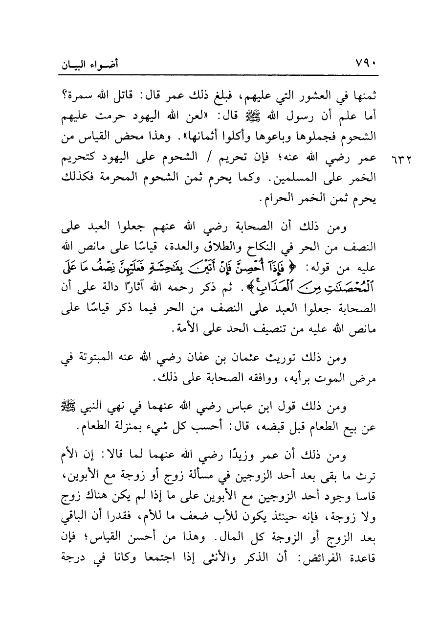 ومن ذلك أن الصحابة رضي الله عنهم جعلوا العبد على النصف من الحر في النكاح والطلاق والعدة، قياسًا على ما نص الله عليه من قوله: {فَإِذَا أُحْصِنَّ فَإِنْ أَتَينَ بِفَاحِشَةٍ فَعَلَيهِنَّ نِصْفُ مَا عَلَى الْمُحْصَنَاتِ مِنَ الْعَذَابِ}. ثم ذكر رحمه الله آثارًا دالة على أن الصحابة جعلوا العبد على النصف من الحر فيما ذكر قياسًا على ما نص الله عليه من تنصيف الحد على الأمة.