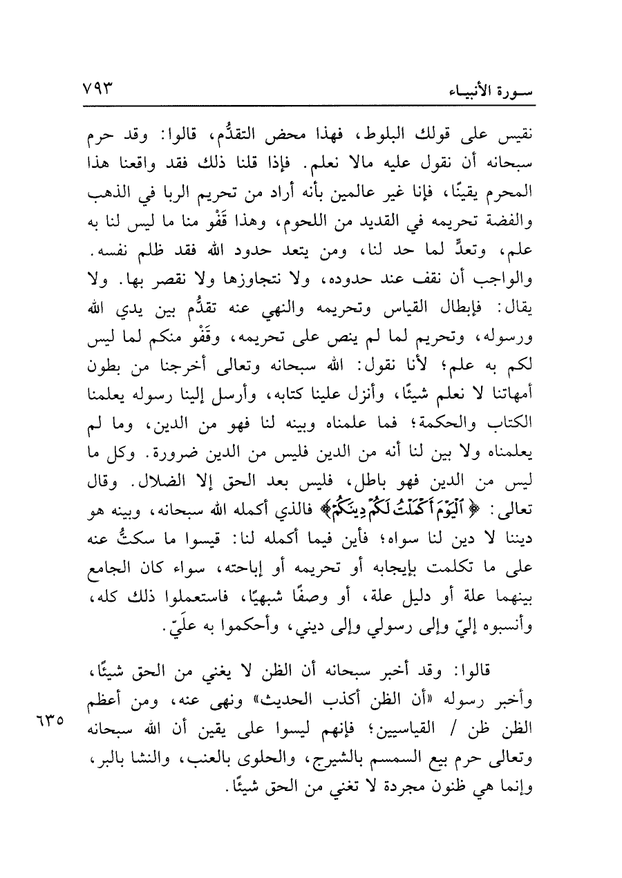 قالوا: وقد أخبر سبحانه أن الظن لا يغني من الحق شيئًا، وأخبر رسوله "أن الظن أكذب الحديث" ونهى عنه، ومن أعظم الظن ظن القياسيين؛ فإنهم ليسوا على يقين أن الله سبحانه وتعالى حرم بيع السمسم بالشيرج، والحلوى بالعنب، والنشا بالبر، وإنما هي ظنون مجردة لا تغني من الحق شيئًا.