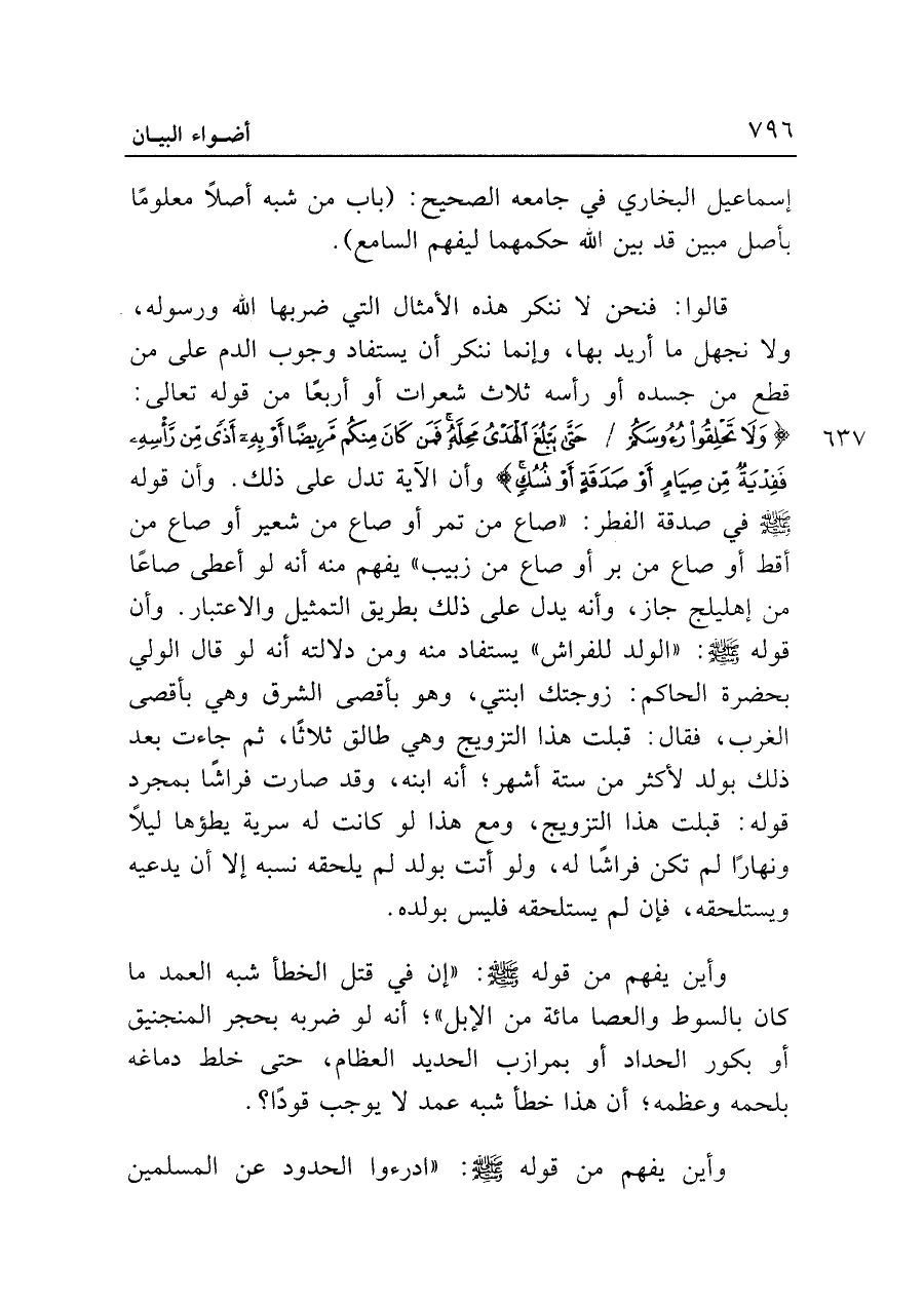 قالوا: فنحن لا ننكر هذه الأمثال التي ضربها الله ورسوله، ولا نجهل ما أريد بها، وإنما ننكر أن يستفاد وجوب الدم على من قطع من جسده أو رأسه ثلاث شعرات أو أربعًا من قوله تعالى: {وَلَا تَحْلِقُوا رُءُوسَكُمْ حَتَّى يَبْلُغَ الْهَدْيُ مَحِلَّهُ فَمَنْ كَانَ مِنْكُمْ مَرِيضًا أَوْ بِهِ أَذًى مِنْ رَأْسِهِ فَفِدْيَةٌ مِنْ صِيَامٍ أَوْ صَدَقَةٍ أَوْ نُسُكٍ} وأن الآية تدل على ذلك. وأن قوله - صلى الله عليه وسلم - في صدقة الفطر: "صاع من تمر أو صاع من شعير أو صاع من أقط أو صاع من بر أو صاع من زبيب" يفهم منه أنه لو أعطى صاعًا من إهليلج جاز، وأنه يدل على ذلك بطريق التمثيل والاعتبار. وأن قوله - صلى الله عليه وسلم -: "الولد للفراش" يستفاد منه ومن دلالته أنه لو قال الولي بحضرة الحاكم: زوجتك ابنتي، وهو بأقصى الشرق وهي بأقصى الغرب، فقال: قبلت هذا التزويج وهي طالق ثلاثًا، ثم جاءت بعد ذلك بولد لأكثر من ستة أشهر؛ أنه ابنه، وقد صارت فراشًا بمجرد قوله: قبلت هذا التزويج، ومع هذا لو كانت له سرية يطؤها ليلًا ونهارًا لم تكن فراشًا له، ولو أتت بولد لم يلحقه نسبه إلا أن يدعيه ويستلحقه، فإن لم يستلحقه فليس بولده.