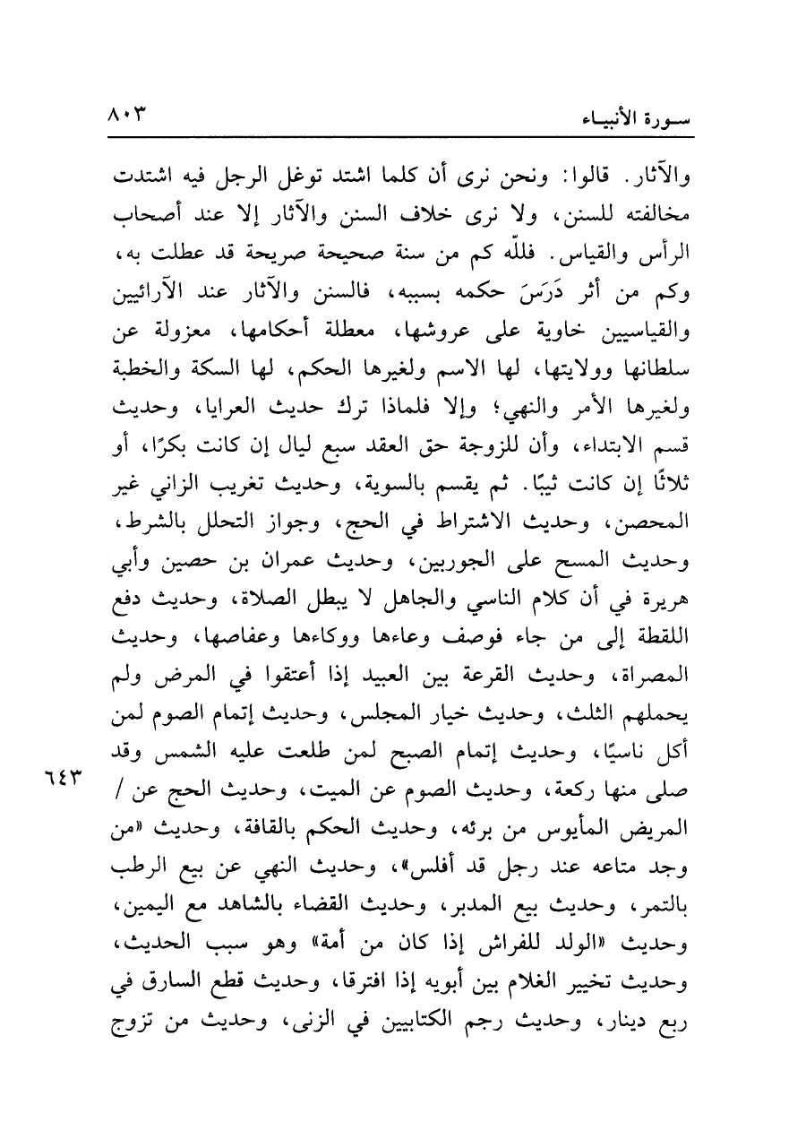 والآثار. قالوا: ونحن نرى أن كلما اشتد توغل الرجل فيه اشتدت مخالفته للسنن، ولا نرى خلاف السنن والآثار إلا عند أصحاب الرأس والقياس. فلله كم من سنة صحيحة صريحة قد عطلت به، وكم من أثر دَرَسَ حكمه بسببه، فالسنن والآثار عند الآرائيين والقياسيين خاوية على عروشها، معطلة أحكامها، معزولة عن سلطانها وولايتها، لها الاسم ولغيرها الحكم، لها السكة والخطبة ولغيرها الأمر والنهي؛ وإلا فلماذا ترك حديث العرايا، وحديث قسم الابتداء، وأن للزوجة حق العقد سبع ليال إن كانت بكرًا، أو ثلاثًا إن كانت ثيبًا. ثم يقسم بالسوية، وحديث تغريب الزاني غير المحصن، وحديث الاشتراط في الحج، وجواز التحلل بالشرط، وحديث المسح على الجوربين، وحديث عمران بن حصين وأبي هريرة في أن كلام الناسي والجاهل لا يبطل الصلاة، وحديث دفع اللقطة إلى من جاء فوصف وعاءها ووكاءها وعفاصها، وحديث المصراة، وحديث القرعة بين العبيد إذا أعتقوا في المرض ولم يحملهم الثلث، وحديث خيار المجلس، وحديث إتمام الصوم لمن أكل ناسيًا، وحديث إتمام الصبح لمن طلعت عليه الشمس وقد صلى منها ركعة، وحديث الصوم عن الميت، وحديث الحج عن المريض المأيوس من برئه، وحديث الحكم بالقافة، وحديث "من وجد متاعه عند رجل قد أفلس"، وحديث النهي عن بيع الرطب بالتمر، وحديث بيع المدبر، وحديث القضاء بالشاهد مع اليمين، وحديث "الولد للفراش إذا كان من أمة" وهو سبب الحديث، وحديث تخيير الغلام بين أبويه إذا افترقا، وحديث قطع السارق في ربع دينار، وحديث رجم الكتابيين في الزنى، وحديث من تزوج