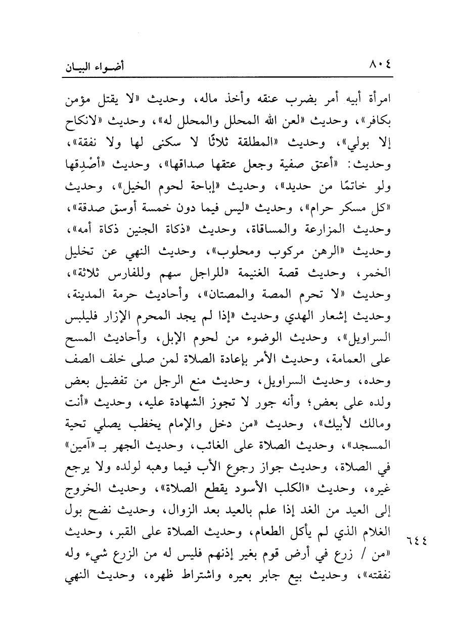 امرأة أبيه أمر بضرب عنقه وأخذ ماله، وحديث "لا يقتل مؤمن بكافر"، وحديث "لعن الله المحلل والمحلل له"، وحديث "لا نكاح إلا بولي"، وحديث "المطلقة ثلاثًا لا سكنى لها ولا نفقة"، وحديث: "أعتق صفية وجعل عتقها صداقها"، وحديت، "أصْدِقها ولو خاتمًا من حديد"، وحديث "إباحة لحوم الخيل"، وحديث "كل مسكر حرام"، وحديث "ليس فيما دون خمسة أوسق صدقة"، وحديث المزارعة والمساقاة، وحديث "ذكاة الجنين ذكاة أمه"، وحديث "الرهن مركوب ومحلوب"، وحديث النهي عن تخليل الخمر، وحديث قصة الغنيمة "للراجل سهم وللفارس ثلاثة"، وحديث "لا تحرم المصة والمصتان"، وأحاديث حرمة المدينة، وحديث إشعار الهدي وحديث "إذا لم يجد المحرم الإزار فليلبس السراويل"، وحديث الوضوء من لحوم الإبل، وأحاديث المسح على العمامة، وحديث الأمر بإعادة الصلاة لمن صلى خلف الصف وحده، وحديث السراويل، وحديث منع الرجل من تفضيل بعض ولده على بعض؛ وأنه جور لا تجوز الشهادة عليه، وحديث "أنت ومالك لأبيك"، وحديث "من دخل والإمام يخطب يصلي تحية المسجد"، وحديث الصلاة على الغائب، وحديث الجهر بـ"آمين" في الصلاة، وحديث جواز رجوع الأب فيما وهبه لولده ولا يرجع غيره، وحديث "الكلب الأسود يقطع الصلاة"، وحديث الخروج إلى العيد من الغد إذا علم بالعيد بعد الزوال، وحديث نضح بول الغلام الذي لم يأكل الطعام، وحديث الصلاة على القبر، وحديث "من زرع في أرض قوم بغير إذنهم فليس له من الزرع شيء وله نفقته"، وحديث بيع جابر بعيره واشتراط ظهره، وحديث النهي