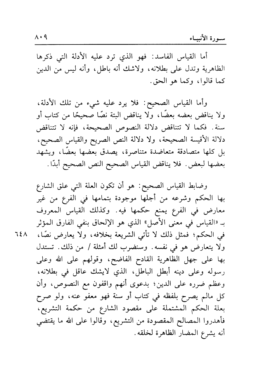 وضابط القياس الصحيح: هو أن تكون العلة التي علق الشارع بها الحكم وشرعه من أجلها موجودة بتمامها في الفرع من غير معارض في الفرع يمنع حكمها فيه. وكذلك القياس المعروف بـ"القياس في معنى الأصل" الذي هو الإلحاق بنفي الفارق المؤثر في الحكم؛ فمثل ذلك لا تأتي الشريعة بخلافه، ولا يعارض نصًّا، ولا يتعارض هو في نفسه. وسنضرب لك أمثلة من ذلك. تستدل بها على جهل الظاهرية القادح الفاضح، وقولهم على الله وعلى رسوله وعلى دينه أبطل الباطل، الذي لا يشك عاقل في بطلانه، وعظم ضرره على الدين؛ بدعوى أنهم واقفون مع النصوص، وأن كل ما لم يصرح بلفظه في كتاب أو سنة فهو معفو عنه، ولو صرح بعلة الحكم المشتملة على مقصود الشارع من حكمة التشريع، فأهدروا المصالح المقصودة من التشريع، وقالوا على الله ما يقتضي أنه يشرع المضار الظاهرة لخلقه.