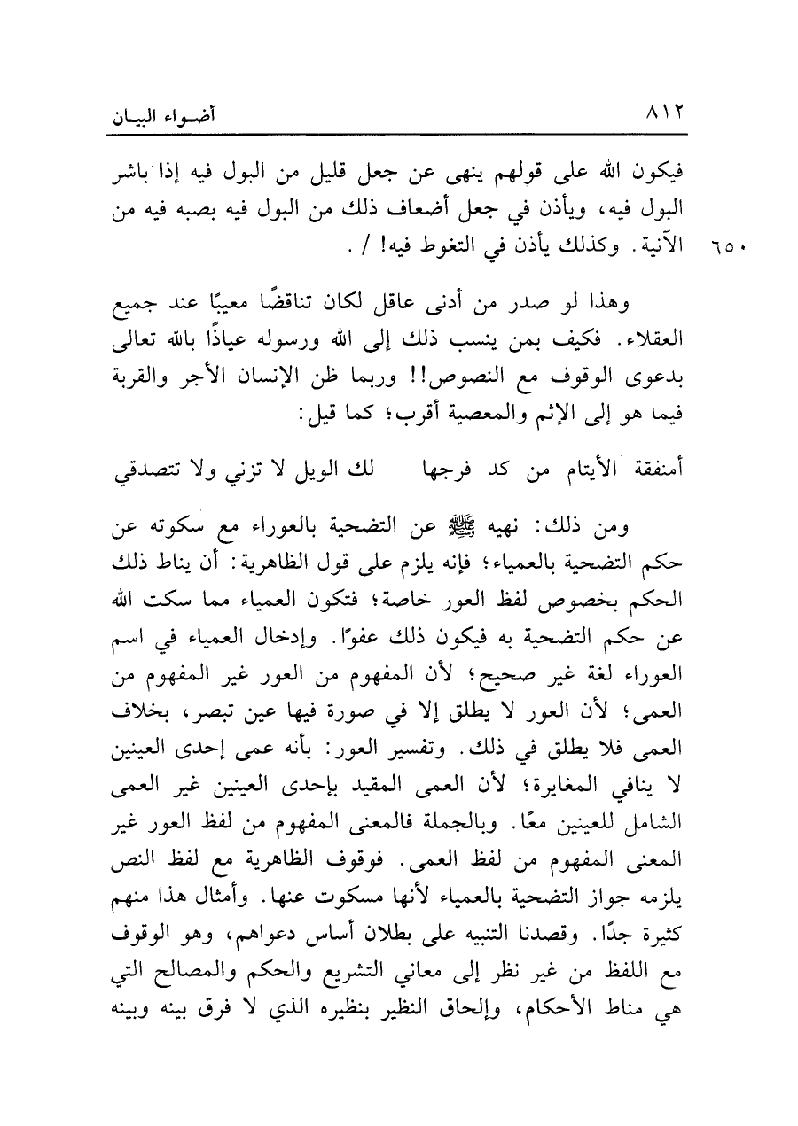 ومن ذلك: نهيه - صلى الله عليه وسلم - عن التضحية بالعوراء مع سكوته عن حكم التضحية بالعمياء؛ فإنه يلزم على قول الظاهرية: أن يناط ذلك الحكم بخصوص لفظ العور خاصة؛ فتكون العمياء مما سكت الله عن حكم التضحية به فيكون ذلك عفوًا. وإدخال العمياء في اسم العوراء لغة غير صحيح؛ لأن المفهوم من العور غير المفهوم من العمى؛ لأن العور لا يطلق إلا في صورة فيها عين تبصر، بخلاف العمى فلا يطلق في ذلك. وتفسير العور: بأنه عمى إحدى العينين لا ينافي المغايرة؛ لأن العمى المقيد بإحدى العينين غير العمى الشامل للعينين معًا. وبالجملة فالمعنى المفهوم من لفظ العور غير المعنى المفهوم من لفظ العمى. فوقوف الظاهرية مع لفظ النص يلزمه جواز التضحية بالعمياء لأنها مسكوت عنها. وأمثال هذا منهم كثيرة جدًا. وقصدنا التنبيه على بطلان أساس دعواهم، وهو الوقوف مع اللفظ من غير نظر إلى معاني التشريع والحكم والمصالح التي هي مناط الأحكام، وإلحاق النظير بنظيره الذي لا فرق بينه وبينه