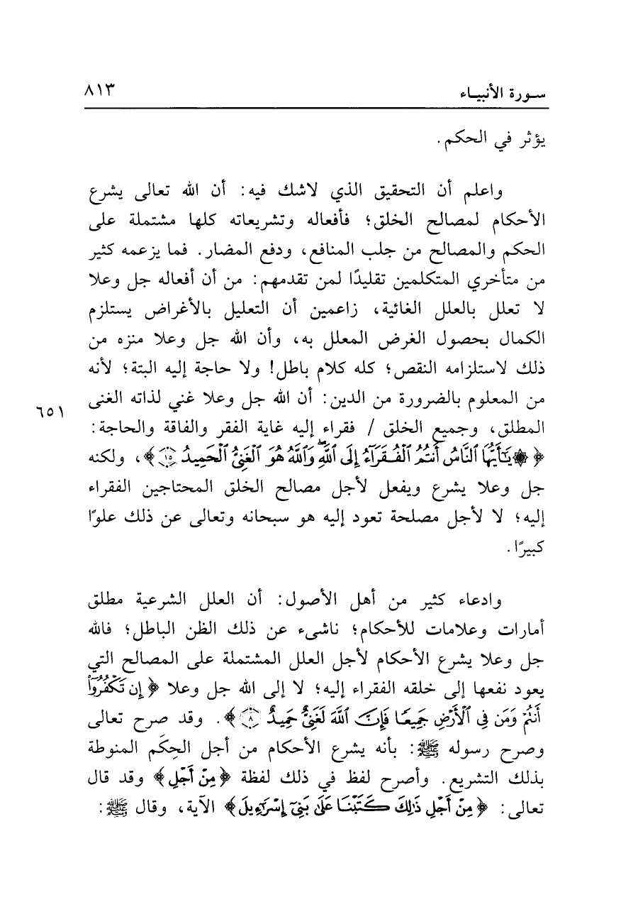 واعلم أن التحقيق الذي لا شك فيه: أن الله تعالى يشرع الأحكام لمصالح الخلق؛ فأفعاله وتشريعاته كلها مشتملة على الحكم والمصالح من جلب المنافع، ودفع المضار. فما يزعمه كثير من متأخري المتكلمين تقليدًا لمن تقدمهم: من أن أفعاله جل وعلا لا تعلل بالعلل الغائية، زاعمين أن التعليل بالأغراض يستلزم الكمال بحصول الغرض المتعلل به، وأن الله جل وعلا منزه من ذلك لاستلزامه النقص؛ كله كلام باطل! ولا حاجة إليه البتة؛ لأنه من المعلوم بالضرورة من الدين: أن الله جل وعلا غني لذاته الغنى المطلق، وجميع الخلق فقراء إليه غاية الفقر والفاقة والحاجة: {يَا أَيُّهَا النَّاسُ أَنْتُمُ الْفُقَرَاءُ إِلَى اللَّهِ وَاللَّهُ هُوَ الْغَنِيُّ الْحَمِيدُ (١٥)}، ولكنه جل وعلا يشرع ويفعل لأجل مصالح الخلق المحتاجين الفقراء إليه؛ لا لأجل مصلحة تعود إليه هو سبحانه وتعالى عن ذلك علوًا كبيرًا.
