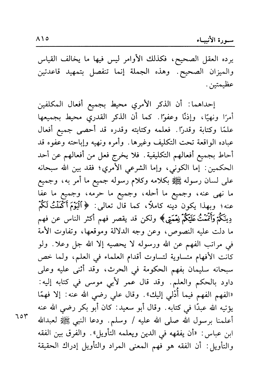 إحداهما: أن الذكر الأمري محيط بجميع أفعال المكلفين أمرًا ونهيًا، وإذنًا وعفوًا. كما أن الذكر القدري محيط بجميعها علمًا وكتابة وقدرًا. فعلمه وكتابته وقدره قد أحصى جميع أفعال عباده الواقعة تحت التكليف وغيرها. وأمره ونهيه وإباحته وعفوه قد أحاط بجميع أفعالهم التكليفية. فلا يخرج فعل من أفعالهم عن أحد الحكمين: إما الكوني، وإما الشرعي الأمري؛ فقد بين الله سبحانه على لسان رسوله - صلى الله عليه وسلم - بكلامه وكلام رسوله جميع ما أمر به، وجميع ما نهى عنه، وجميع ما أحله، وجميع ما حرمه، وجميع ما عفا عنه؛ وبهذا يكون دينه كاملًا، كما قال تعالى: {الْيَوْمَ أَكْمَلْتُ لَكُمْ دِينَكُمْ وَأَتْمَمْتُ عَلَيكُمْ نِعْمَتِي} ولكن قد يقصر فهم أكثر الناس عن فهم ما دلت عليه النصوص، وعن وجه الدلالة وموقعها، وتفاوت الأمة في مراتب الفهم عن الله ورسوله لا يحصيه إلا الله جل وعلا. ولو كانت الأفهام متساوية لتساوت أقدام العلماء في العلم، ولما خص سبحانه سليمان بفهم الحكومة في الحرث، وقد أثنى عليه وعلى داود بالحكم والعلم. وقد قال عمر لأبي موسى في كتابه إليه: "الفهم الفهم فيما أُدْلي إليك". وقال علي رضي الله عنه: إلا فهمًا يؤتيه الله عبدًا في كتابه. وقال أبو سعيد: كان أبو بكر رضي الله عنه أعلمنا برسول الله صلى الله عليه وسلم. ودعا النبي - صلى الله عليه وسلم - لعبد الله ابن عباس: "أن يفقهه في الدين ويعلمه التأويل". والفرق بين الفقه والتأويل: أن الفقه هو فهم المعنى المراد والتأويل إدراك الحقيقة