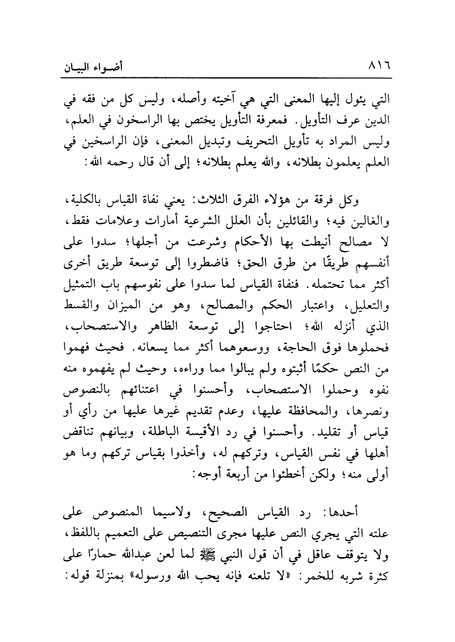 وكل فرقة من هؤلاء الفرق الثلاث: يعني نفاة القياس بالكلية، والغالين فيه؛ والقائلين بأن العلل الشرعية أمارات وعلامات فقط، لا مصالح أنيطت بها الأحكام وشرعت من أجلها؛ سدوا على أنفسهم طريقًا من طرق الحق؛ فاضطروا إلى توسعة طريق أخرى أكثر مما تحتمله. فنفاة القياس لما سدوا على نفوسهم باب التمثيل والتعليل، واعتبار الحكم والمصالح، وهو من الميزان والقسط الذي أنزله الله؛ احتاجوا إلى توسعة الظاهر والاستصحاب، فحملوها فوق الحاجة، ووسعوهما أكثر مما يسعانه. فحيث فهموا من النص حكمًا أثبتوه ولم يبالوا مما وراءه، وحيث لم يفهموه منه نفوه وحملوا الاستصحاب، وأحسنوا في اعتنائهم بالنصوص ونصرها، والمحافظة عليها، وعدم تقديم غيرها عليها من رأي أو قياس أو تقليد. وأحسنوا في رد الأقيسة الباطلة، وبيانهم تناقض أهلها في نفس القياس، وتركهم له، وأخذوا بقياس تركهم وما هو أولى منه؛ ولكن أخطئوا من أربعة أوجه: