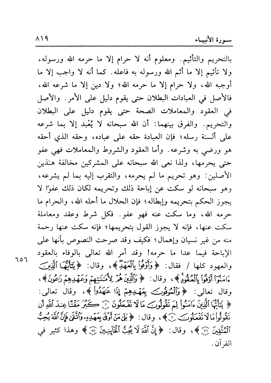 بالتحريم والتأثيم. ومعلوم أنه لا حرام إلا ما حرمه الله ورسوله، ولا تأثيم إلا ما أثم الله ورسوله به فاعله. كما أنه لا واجب إلا ما أوجبه الله، ولا حرام إلا ما حرمه الله؛ ولا دين إلا ما شرعه الله، فالأصل في العبادات البطلان حتى يقوم دليل على الأمر. والأصل في العقود والمعاملات الصحة حتى يقوم دليل على البطلان والتحريم. والفرق بينهما: أن الله سبحانه لا يُعْبد إلا بما شرعه على ألسنة رسله؛ فإن العبادة حقه على عباده، وحقه الذي أحقه هو ورضي به وشرعه. وأما العقود والشروط والمعاملات فهي عفو حتى يحرمها، ولذا نعى الله سبحانه على المشركين مخالفة هذين الأصلين: وهو تحريم ما لم يحرمه، والتقرب إليه بما لم يشرعه، وهو سبحانه لو سكت عن إباحة ذلك وتحريمه لكان ذلك عفوًا لا يجوز الحكم بتحريمه وإبطاله؛ فإن الحلال ما أحله الله، والحرام ما حرمه الله، وما سكت عنه فهو عفو. فكل شرط وعقد ومعاملة سكت عنها، فإنه لا يجوز القول بتحريمها؛ فإنه سكت عنها رحمة منه من غير نسيان وإهمال؛ فكيف وقد صرحت النصوص بأنها على الإباحة فيماعدا ما حرمه! وقد أمر الله تعالى بالوفاء بالعقود والعهود كلها فقال: {وَأَوْفُوا بِالْعَهْدِ}، وقال {يَا أَيُّهَا الَّذِينَ آمَنُوا أَوْفُوا بِالْعُقُودِ}، وقال: {وَالَّذِينَ هُمْ لِأَمَانَاتِهِمْ وَعَهْدِهِمْ رَاعُونَ}، وقال تعالى: {وَالْمُوفُونَ بِعَهْدِهِمْ إِذَا عَاهَدُوا}، وقال تعالى: {يَا أَيُّهَا الَّذِينَ آمَنُوا لِمَ تَقُولُونَ مَا لَا تَفْعَلُونَ (٢) كَبُرَ مَقْتًا عِنْدَ اللَّهِ أَنْ تَقُولُوا مَا لَا تَفْعَلُونَ (٣)}، وقال: {بَلَى مَنْ أَوْفَى بِعَهْدِهِ وَاتَّقَى فَإِنَّ اللَّهَ يُحِبُّ الْمُتَّقِينَ (٧٦)}، وقال: {إِنَّ اللَّهَ لَا يُحِبُّ الْخَائِنِينَ (٥٨)} وهذا كثير في القرآن.