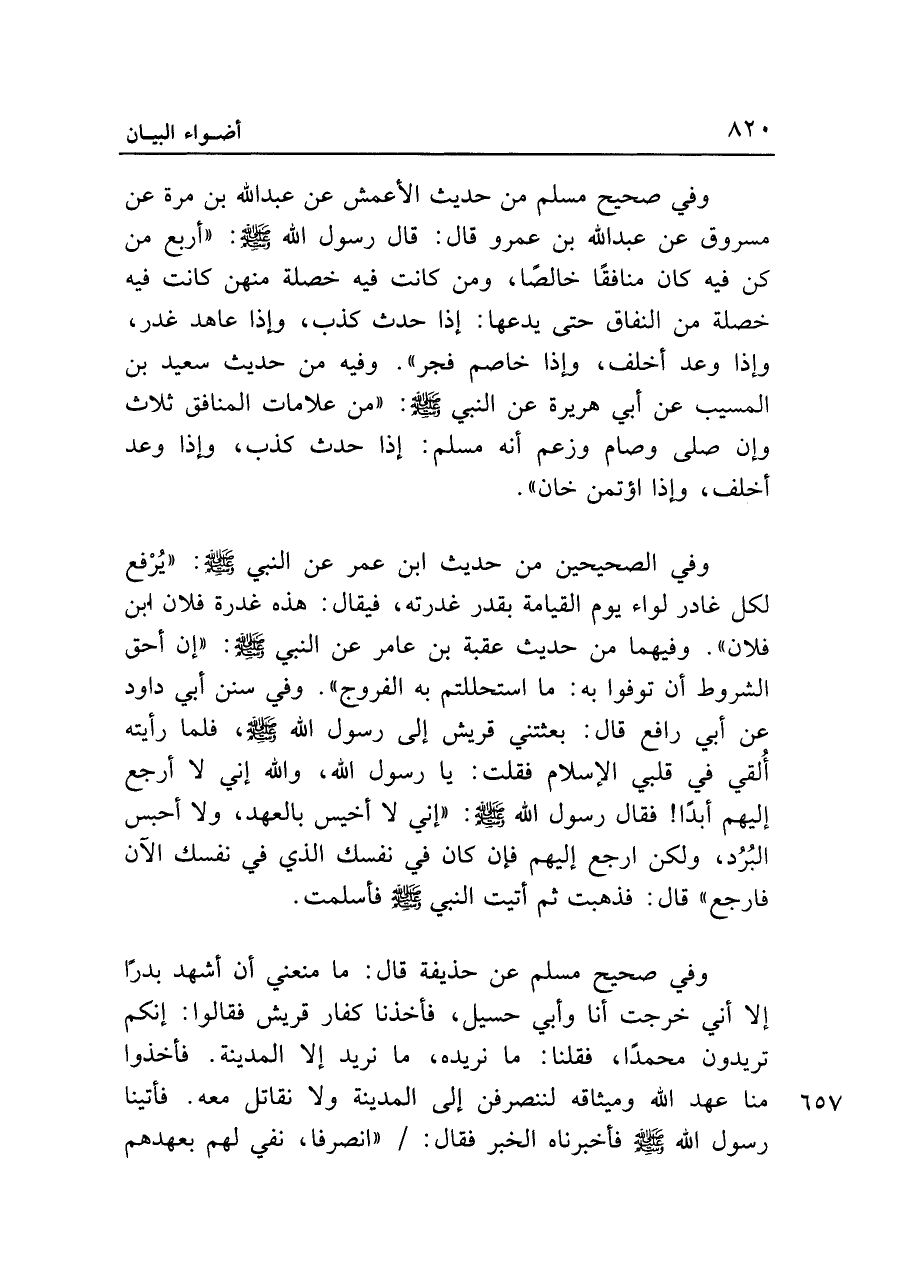 وفي الصحيحين من حديث ابن عمر عن النبي - صلى الله عليه وسلم -: "يُرْفع لكل غادر لواء يوم القيامة بقدر غدرته، فيقال: هذه غدرة فلان ابن فلان". وفيهما من حديث عقبة بن عامر عن النبي - صلى الله عليه وسلم -: "إن أحق الشروط أن توفوا به: ما استحللتم به الفروج". وفي سنن أبي داود عن أبي رافع قال: بعثتني قريش إلى رسول الله - صلى الله عليه وسلم -، فلما رأيته أُلقي في قلبي الإسلام فقلت: يا رسول الله، والله إني لا أرجع إليهم أبدًا! فقال رسول الله - صلى الله عليه وسلم -: "إني لا أخيس بالعهد، ولا أحبس البُرُد، ولكن ارجع إليهم فإن كان في نفسك الذي في نفسك الآن فارجع" قال: فذهبت ثم أتيت النبي - صلى الله عليه وسلم - فأسلمت.