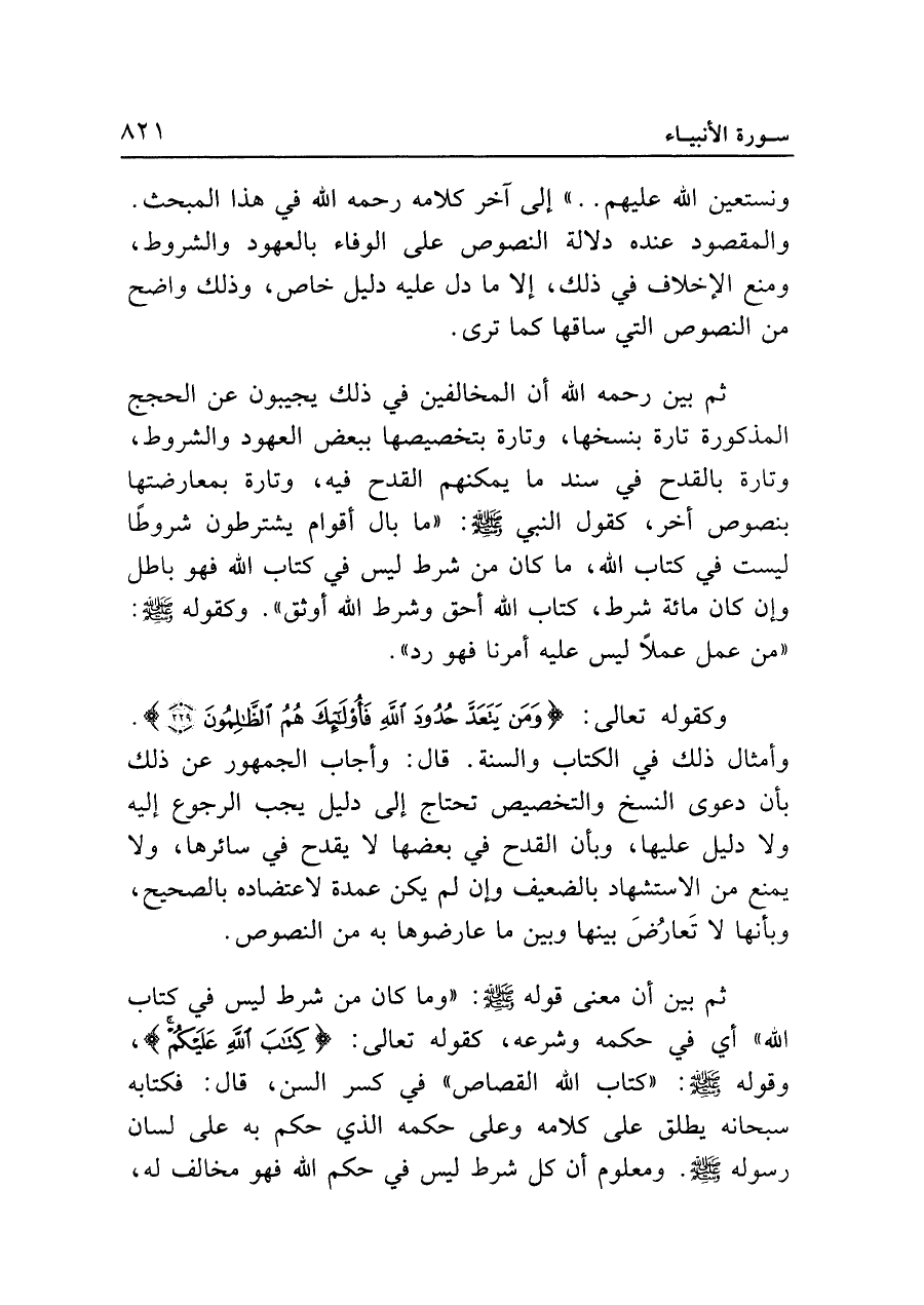 ثم بين رحمه الله أن المخالفين في ذلك يجيبون عن الحجج المذكورة تارة بنسخها، وتارة بتخصيصها ببعض العهود والشروط، وتارة بالقدح في سند ما يمكنهم القدح فيه، وتارة بمعارضتها بنصوص أخر، كقول النبي - صلى الله عليه وسلم -: "ما بال أقوام يشترطون شروطًا ليست في كتاب الله، ما كان من شرط ليس في كتاب الله فهو باطل وإن كان مائة شرط، كتاب الله أحق وشرط الله أوثق". وكقوله - صلى الله عليه وسلم -: "من عمل عملًا ليس عليه أمرنا فهو رد".