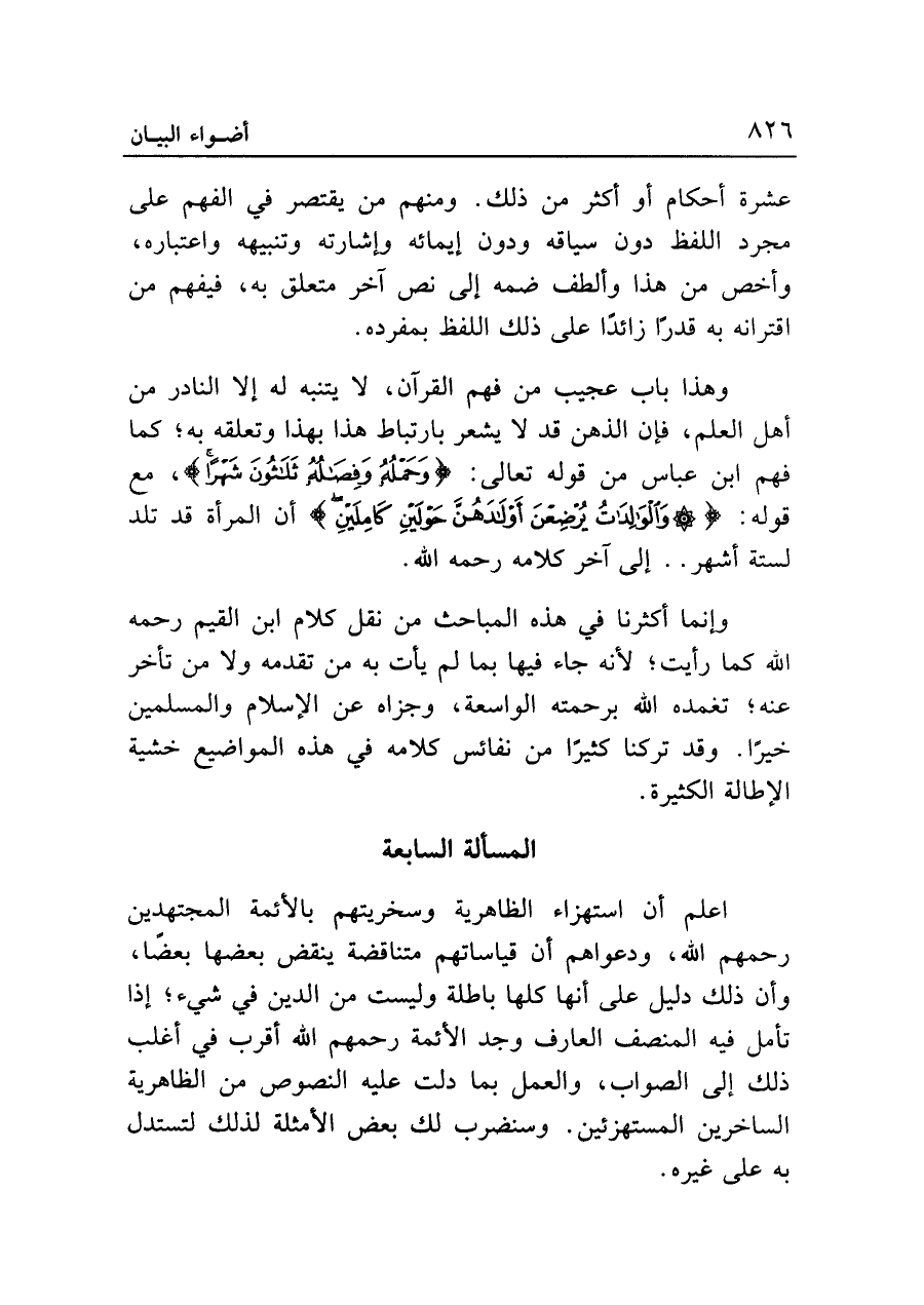 وهذا باب عجيب من فهم القرآن، لا يتنبه له إلا النادر من أهل العلم، فإن الذهن قد لا يشعر بارتباط هذا بهذا وتعلقه به؛ كما فهم ابن عباس من قوله تعالى: {وَحَمْلُهُ وَفِصَالُهُ ثَلَاثُونَ شَهْرًا}، مع قوله: {وَالْوَالِدَاتُ يُرْضِعْنَ أَوْلَادَهُنَّ حَوْلَينِ كَامِلَينِ} أن المرأة قد تلد لستة أشهر .. إلى آخر كلامه رحمه الله.