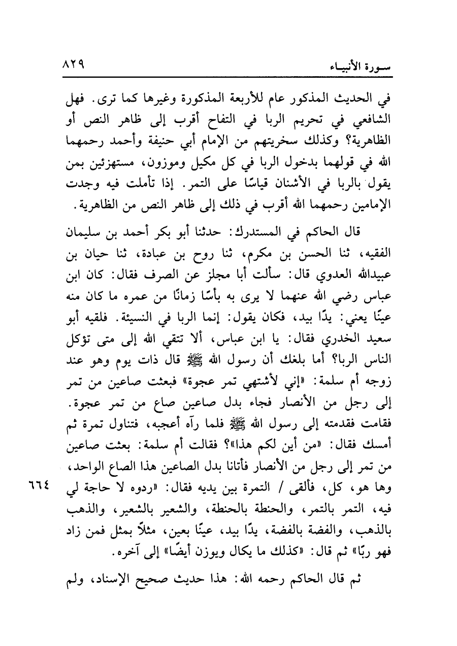 قال الحاكم في المستدرك: حدثنا أبو بكر أحمد بن سليمان الفقيه، ثنا الحسن بن مكرم، ثنا روح بن عبادة، ثنا حيان بن عبيد الله العدوي قال: سألت أبا مجلز عن الصرف فقال: كان ابن عباس رضي الله عنهما لا يرى به بأسًا زمانًا من عمره ما كان منه عينًا يعني: يدًا بيد، فكان يقول: إنما الربا في النسيئة. فلقيه أبو سعيد الخدري فقال: يا ابن عباس، ألا تتقي الله إلى متى تؤكل الناس الربا؟ أما بلغك أن رسول الله - صلى الله عليه وسلم - قال ذات يوم وهو عند زوجه أم سلمة: "إني لأشتهي تمر عجوة" فبعثت صاعين من تمر إلى رجل من الأنصار فجاء بدل صاعين صاع من تمر عجوة. فقامت فقدمته إلى رسول الله - صلى الله عليه وسلم - فلما رآه أعجبه، فتناول تمرة ثم أمسك فقال: "من أين لكم هذا"؟ فقالت أم سلمة: بعثت صاعين من تمر إلى رجل من الأنصار فأتانا بدل الصاعين هذا الصاع الواحد، وها هو، كل، فالقى التمرة بين يديه فقال: "ردوه لا حاجة لي فيه، التمر بالتمر، والحنطة بالحنطة، والشعير بالشعير، والذهب بالذهب، والفضة بالفضة، يدًا بيد، عينًا بعين، مثلًا بمثل فمن زاد فهو ربًا" ثم قال: "كذلك ما يكال ويوزن أيضًا" إلى آخره.
