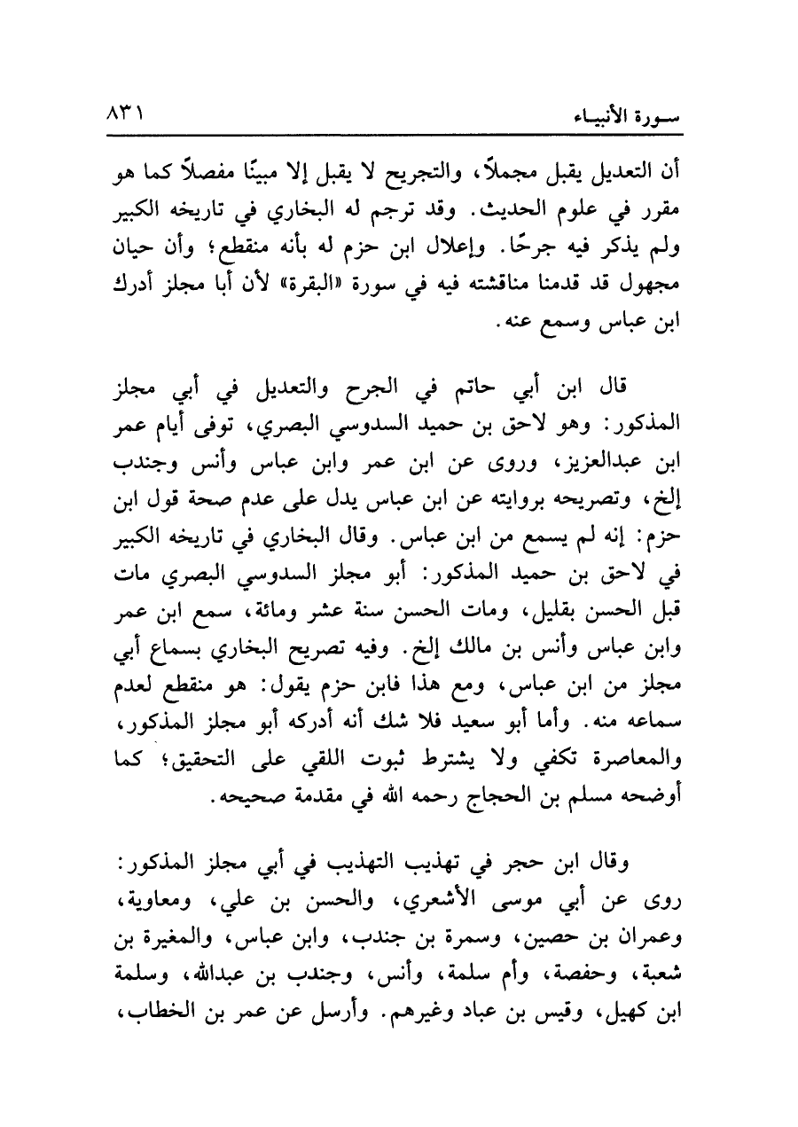 أن التعديل يقبل مجملًا، والتجريح لا يقبل إلا مبينًا مفصلًا كما هو مقرر في علوم الحديث. وقد ترجم له البخاري في تاريخه الكبير ولم يذكر فيه جرحًا. وإعلال ابن حزم له بأنه منقطع؛ وأن حيان مجهول قد قدمنا مناقشته فيه في سورة "البقرة" لأن أبا مجلز أدرك ابن عباس وسمع عنه.