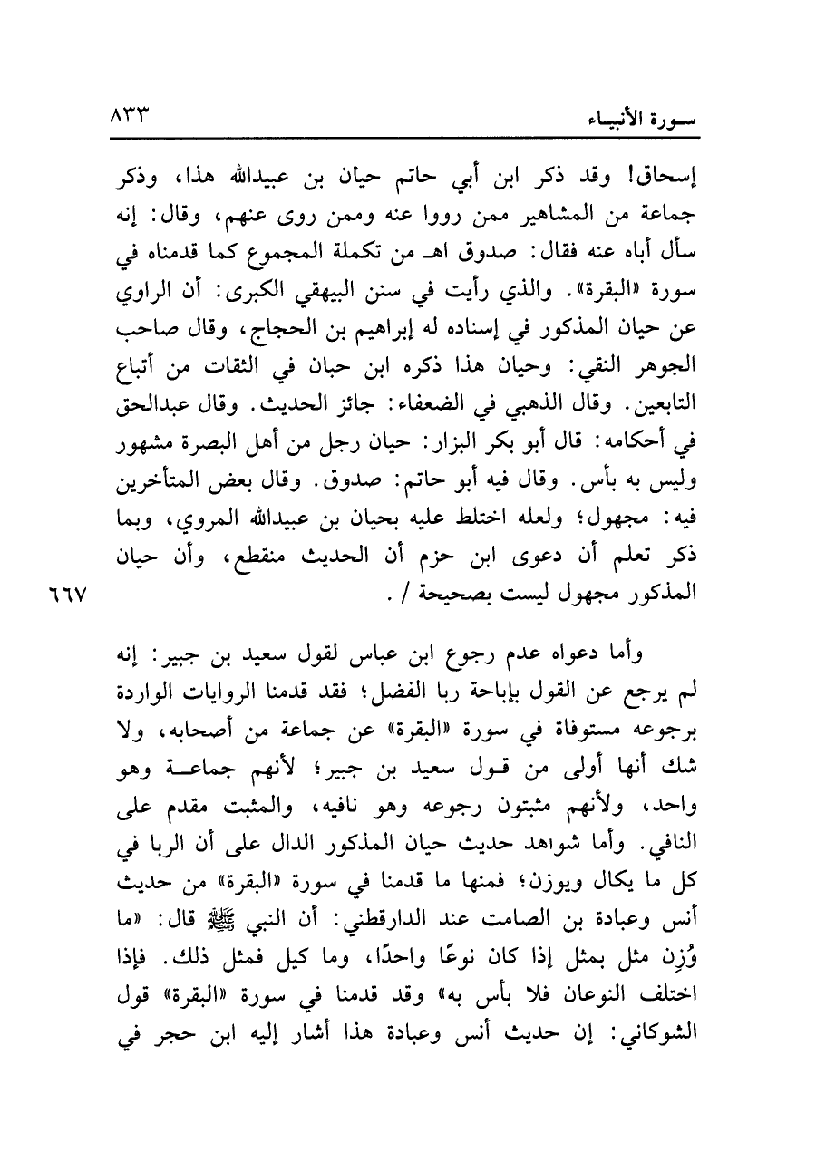 وأما دعواه عدم رجوع ابن عباس لقول سعيد بن جبير: إنه لم يرجع عن القول بإباحة ربا الفضل؛ فقد قدمنا الروايات الواردة برجوعه مستوفاة في سورة "البقرة" عن جماعة من أصحابه، ولا شك أنها أولى من قول سعيد بن جبير؛ لأنهم جماعة وهو واحد، ولأنهم مثبتون رجوعه وهو نافيه، والمثبت مقدم على النافي. وأما شواهد حديث حيان المذكور الدال على أن الربا في كل ما يكال ويوزن؛ فمنها ما قدمنا في سورة "البقرة" من حديث أنس وعبادة بن الصامت عند الدارقطني: أن النبي - صلى الله عليه وسلم - قال: "ما وُزِن مثل بمثل إذا كان نوعًا واحدًا، وما كيل فمثل ذلك. فإذا اختلف النوعان فلا بأس به" وقد قدمنا في سورة "البقرة" قول الشوكاني: إن حديث أنس وعبادة هذا أشار إليه ابن حجر في