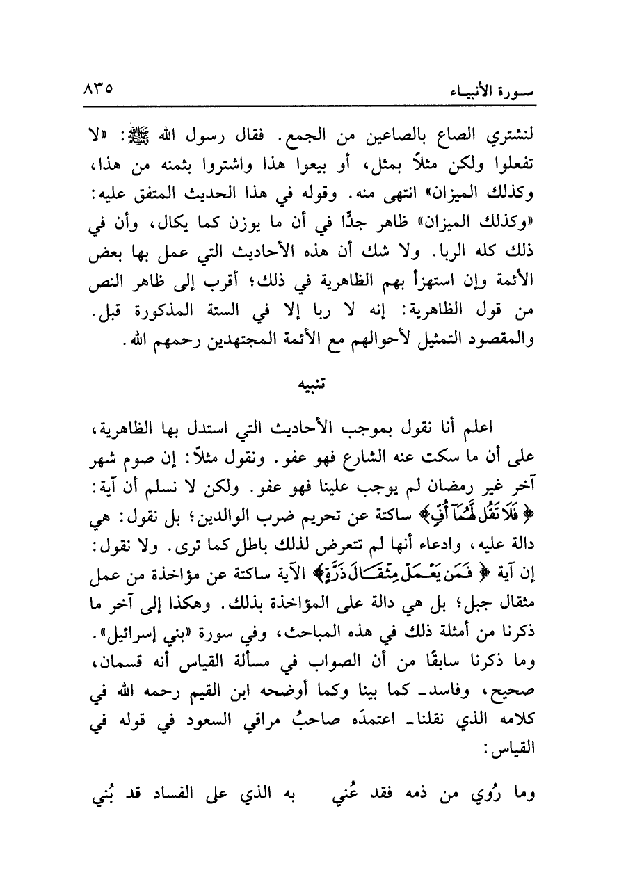 لنشتري الصاع بالصاعين من الجمع. فقال رسول الله - صلى الله عليه وسلم -: "لا تفعلوا ولكن مثلًا بمثل، أو بيعوا هذا واشتروا بثمنه من هذا، وكذلك الميزان" انتهى منه. وقوله في هذا الحديث المتفق عليه: "وكذلك الميزان" ظاهر جدًا في أن ما يوزن كما يكال، وأن في ذلك كله الربا. ولا شك أن هذه الأحاديث التي عمل بها بعض الأئمة وإن استهزأ بهم الظاهرية في ذلك؛ أقرب إلى ظاهر النص من قول الظاهرية: إنه لا ربا إلا في الستة المذكورة قبل. والمقصود التمثيل لأحوالهم مع الأئمة المجتهدين رحمهم الله.
