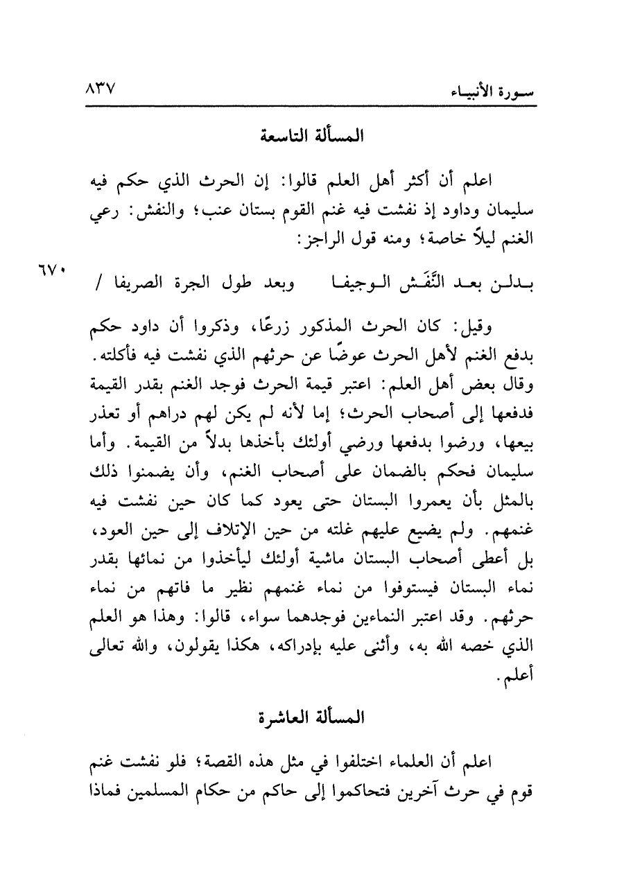 وقيل: كان الحرث المذكور زرعًا، وذكروا أن داود حكم بدفع الغنم لأهل الحرث عوضًا عن حرثهم الذي نفشت فيه فأكلته. وقال بعض أهل العلم: اعتبر قيمة الحرث فوجد الغنم بقدر القيمة فدفعها إلى أصحاب الحرث؛ إما لأنه لم يكن لهم دراهم أو تعذر بيعها، ورضوا بدفعها ورضي أولئك بأخذها بدلًا من القيمة. وأما سليمان فحكم بالضمان على أصحاب الغنم، وأن يضمنوا ذلك بالمثل بأن يعمروا البستان حتى يعود كما كان حين نفشت فيه غنمهم. ولم يضيع عليهم غلته من حين الإتلاف إلى حين العود، بل أعطى أصحاب البستان ماشية أولئك ليأخذوا من نمائها بقدر نماء البستان فيستوفوا من نماء غنمهم نظير ما فاتهم من نماء حرثهم. وقد اعتبر النماءين فوجدهما سواء، قالوا: وهذا هو العلم الذي خصه الله به، وأثنى عليه بإدراكه، هكذا يقولون، والله تعالى أعلم.
