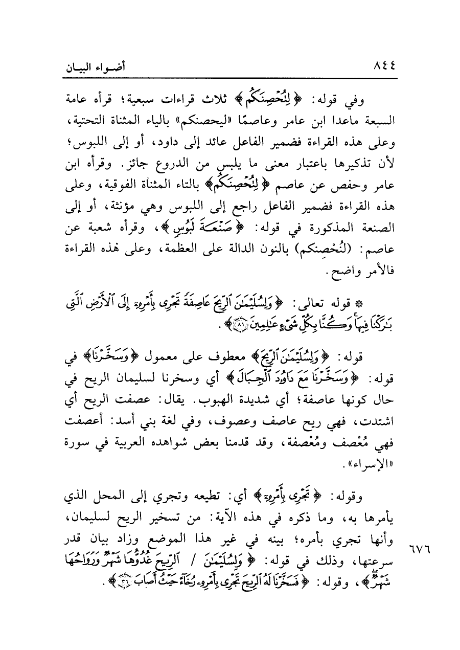 وفي قوله: {لِتُحْصِنَكُمْ} ثلاث قراءات سبعية؛ قرأه عامة السبعة ماعدا ابن عامر وعاصمًا "ليحصنكم" بالياء المثناة التحتية، وعلى هذه القراءة فضمير الفاعل عائد إلى داود، أو إلى اللبوس؛ لأن تذكيرها باعتبار معنى ما يلبس من الدروع جائز. وقرأه ابن عامر وحفص عن عاصم {لِتُحْصِنَكُمْ} بالتاء المثناة الفوقية، وعلى هذه القراءة فضمير الفاعل راجع إلى اللبوس وهي مؤنثة، أو إلى الصنعة المذكورة في قوله: {صَنْعَةَ لَبُوسٍ}، وقرأه شعبة عن عاصم: {لِنُحْصِنَكُمْ} بالنون الدالة على العظمة، وعلى هذه القراءة فالأمر واضح.