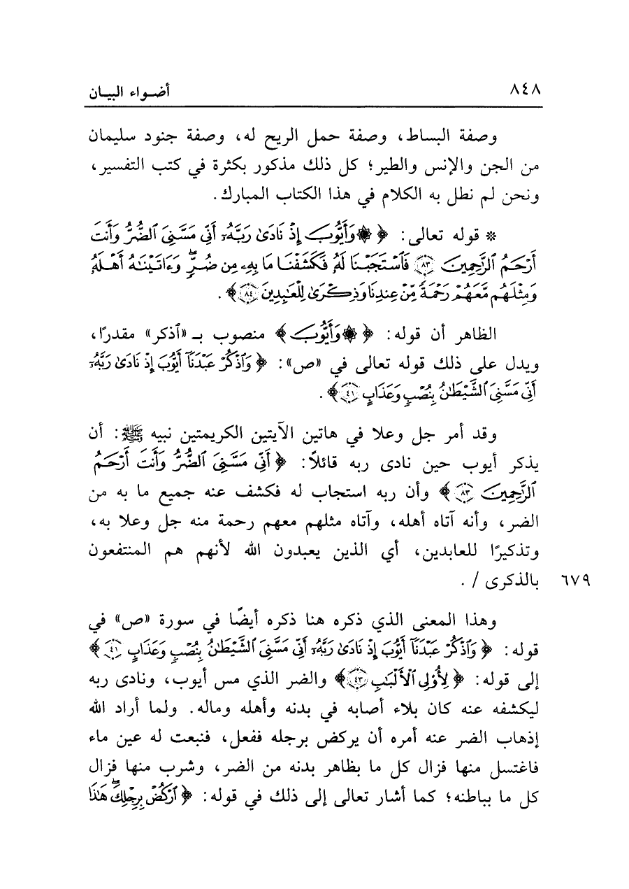 وهذا المعنى الذي ذكره هنا ذكره أيضًا في سورة "ص" في قوله: {وَاذْكُرْ عَبْدَنَا أَيُّوبَ إِذْ نَادَى رَبَّهُ أَنِّي مَسَّنِيَ الشَّيطَانُ بِنُصْبٍ وَعَذَابٍ (٤١)} إلى قوله: {لِأُولِي الْأَلْبَابِ (٤٣)} والضر الذي مس أيوب، ونادى ربه ليكشفه عنه كان بلاء أصابه في بدنه وأهله وماله. ولما أراد الله إذهاب الضر عنه أمره أن يركض برجله ففعل، فنبعت له عين ماء فاغتسل منها فزال كل ما بظاهر بدنه من الضر، وشرب منها فزال كل ما بباطنه؛ كما أشار تعالى إلى ذلك في قوله: {ارْكُضْ بِرِجْلِكَ هَذَا