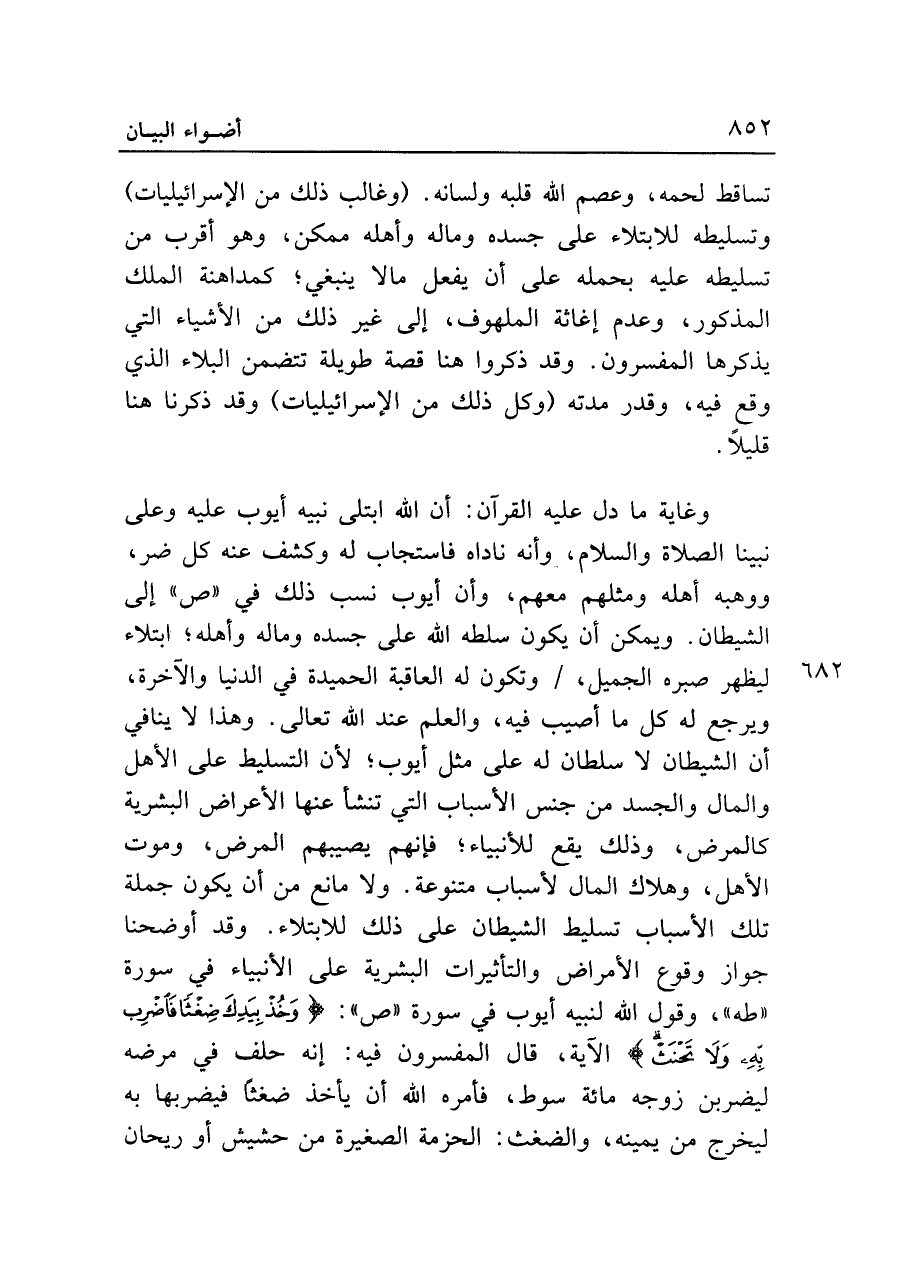 وغاية ما دل عليه القرآن: أن الله ابتلى نبيه أيوب عليه وعلى نبينا الصلاة والسلام، وأنه ناداه فاستجاب له وكشف عنه كل ضر، ووهبه أهله ومثلهم معهم، وأن أيوب نسب ذلك في "ص" إلى الشيطان. ويمكن أن يكون سلطه الله على جسده وماله وأهله؛ ابتلاء ليظهر صبره الجميل، وتكون له العاقبة الحميدة في الدنيا والآخرة، ويرجع له كل ما أصيب فيه، والعلم عند الله تعالى. وهذا لا ينافي أن الشيطان لا سلطان له على مثل أيوب؛ لأن التسليط على الأهل والمال والجسد من جنس الأسباب التي تنشأ عنها الأعراض البشرية كالمرض، وذلك يقع للأنبياء؛ فإنهم يصيبهم المرض، وموت الأهل، وهلاك المال لأسباب متنوعة. ولا مانع من أن يكون جملة تلك الأسباب تسليط الشيطان على ذلك للابتلاء. وقد أوضحنا جواز وقوع الأمراض والتأثيرات البشرية على الأنبياء في سورة "طه"، وقول الله لنبيه أيوب في سورة "ص": {وَخُذْ بِيَدِكَ ضِغْثًا فَاضْرِبْ بِهِ وَلَا تَحْنَثْ} الآية، قال المفسرون فيه: إنه حلف في مرضه ليضربن زوجه مائة سوط، فأمره الله أن يأخذ ضغثًا فيضربها به ليخرج من يمينه، والضغث: الحزمة الصغيرة من حشيش أو ريحان