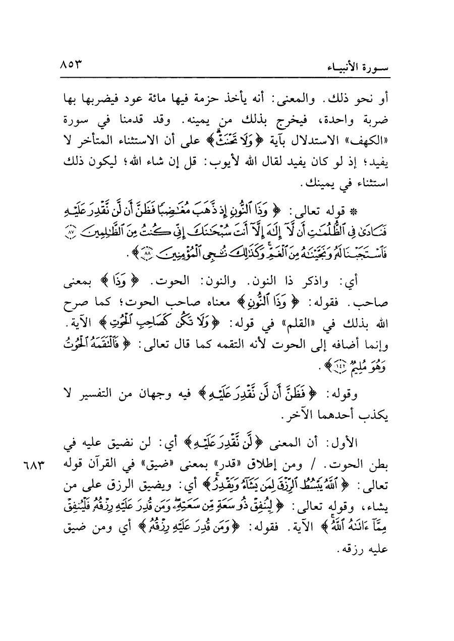 الأول: أن المعنى {لَنْ نَقْدِرَ عَلَيهِ} أي: لن نضيق عليه في بطن الحوت. ومن إطلاق "قدر" بمعنى "ضيق" في القرآن قوله تعالى: {اللَّهُ يَبْسُطُ الرِّزْقَ لِمَنْ يَشَاءُ وَيَقْدِرُ} أي: ويضيق الرزق على من شاء، وقوله تعالى: {لِيُنْفِقْ ذُو سَعَةٍ مِنْ سَعَتِهِ وَمَنْ قُدِرَ عَلَيهِ رِزْقُهُ فَلْيُنْفِقْ مِمَّا آتَاهُ اللَّهُ} الآية. فقوله: {وَمَنْ قُدِرَ عَلَيهِ رِزْقُهُ} أي ومن ضيق عليه رزقه.