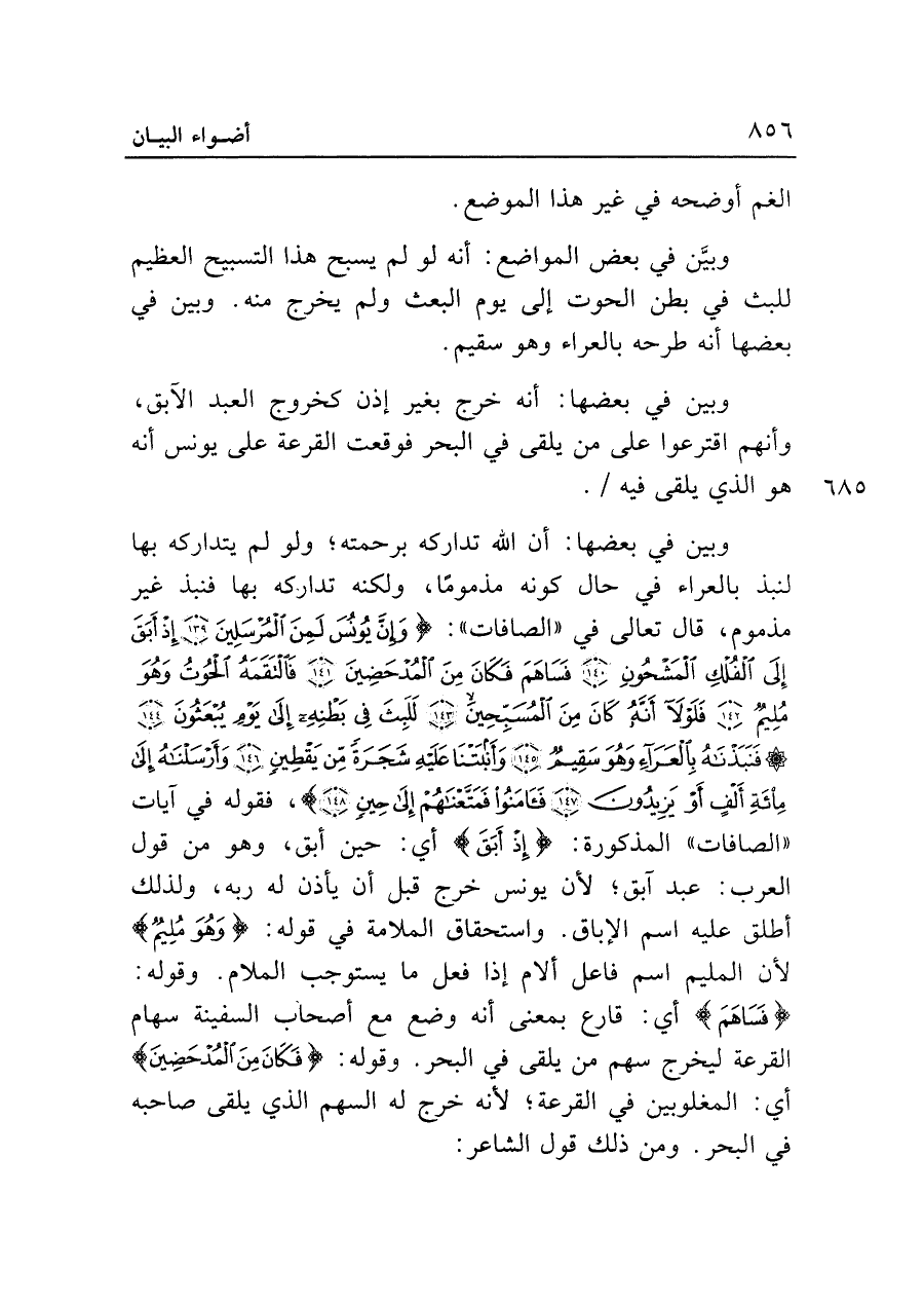 وبين في بعضها: أن الله تداركه برحمته؛ ولو لم يتداركه بها لنبذ بالعراء في حال كونه مذمومًا، ولكنه تداركه بها فنبذ غير مذموم، قال تعالى في "الصافات": {وَإِنَّ يُونُسَ لَمِنَ الْمُرْسَلِينَ (١٣٩) إِذْ أَبَقَ إِلَى الْفُلْكِ الْمَشْحُونِ (١٤٠) فَسَاهَمَ فَكَانَ مِنَ الْمُدْحَضِينَ (١٤١) فَالْتَقَمَهُ الْحُوتُ وَهُوَ مُلِيمٌ (١٤٢) فَلَوْلَا أَنَّهُ كَانَ مِنَ الْمُسَبِّحِينَ (١٤٣) لَلَبِثَ فِي بَطْنِهِ إِلَى يَوْمِ يُبْعَثُونَ (١٤٤) فَنَبَذْنَاهُ بِالْعَرَاءِ وَهُوَ سَقِيمٌ (١٤٥) وَأَنْبَتْنَا عَلَيهِ شَجَرَةً مِنْ يَقْطِينٍ (١٤٦) وَأَرْسَلْنَاهُ إِلَى مِائَةِ أَلْفٍ أَوْ يَزِيدُونَ (١٤٧) فَآمَنُوا فَمَتَّعْنَاهُمْ إِلَى حِينٍ (١٤٨)}، فقوله في آيات "الصافات" المذكورة: {إِذْ أَبَقَ} أي: حين أبق، وهو من قول العرب: عبد آبق؛ لأن يونس خرج قبل أن يأذن له ربه، ولذلك أطلق عليه اسم الإباق. واستحقاق الملامة في قوله: {وَهُوَ مُلِيمٌ} لأن المليم اسم فاعل ألام إذا فعل ما يستوجب الملام. وقوله: {فَسَاهَمَ} أي: قارع بمعنى أنه وضع مع أصحاب السفينة سهام القرعة ليخرج سهم من يلقى في البحر. وقوله: {فَكَانَ مِنَ الْمُدْحَضِينَ} أي: المغلوبين في القرعة؛ لأنه خرج له السهم الذي يلقى صاحبه في البحر. ومن ذلك قول الشاعر: