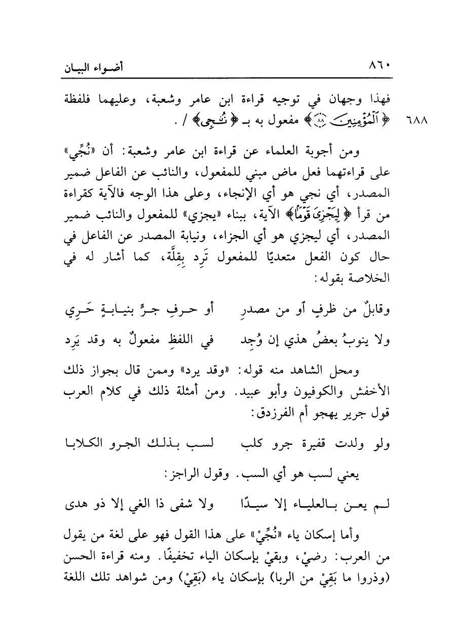 ومن أجوبة العلماء عن قراءة ابن عامر وشعبة: أن "نُجِّي" على قراءتهما فعل ماض مبني للمفعول، والنائب عن الفاعل ضمير المصدر، أي نجي هو أي الإنجاء، وعلى هذا الوجه فالآية كقراءة من قرأ {لِيَجْزِيَ قَوْمًا} الآية، ببناء "يجزي" للمفعول والنائب ضمير المصدر، أي ليجزي هو أي الجزاء، ونيابة المصدر عن الفاعل في حال كون الفعل متعديًا للمفعول تَرِد بقِلَّة، كما أشار له في الخلاصة بقوله: